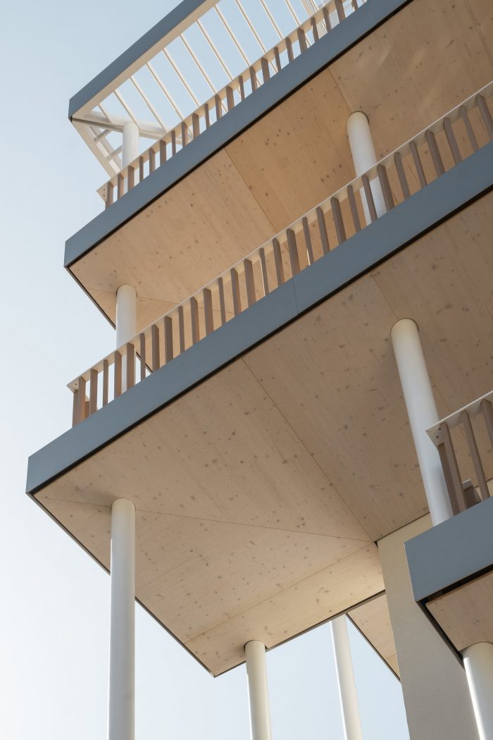It is made of CLT (Cross Laminated Timber) for the floor, façade, and walls from the first floor upwards, and combines bioclimatic design, control energy use, and carbon storage with more than 2,000 m3 of solid wood in the structure.