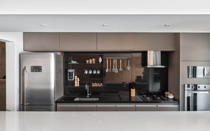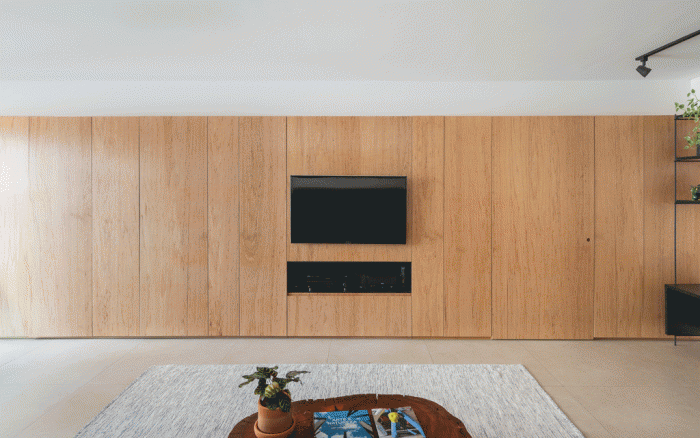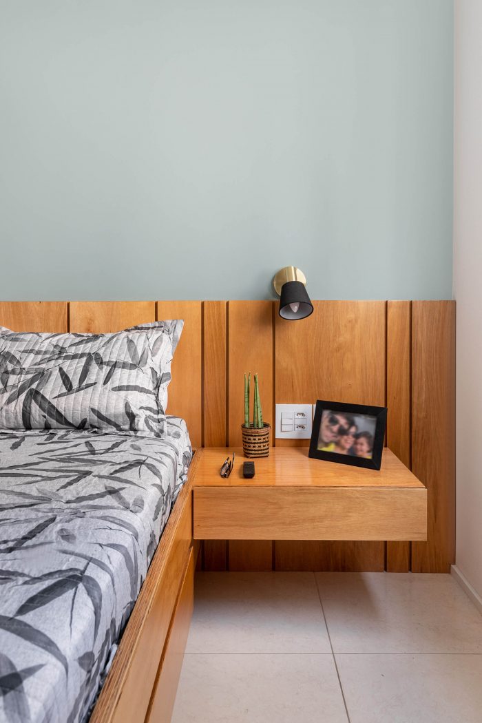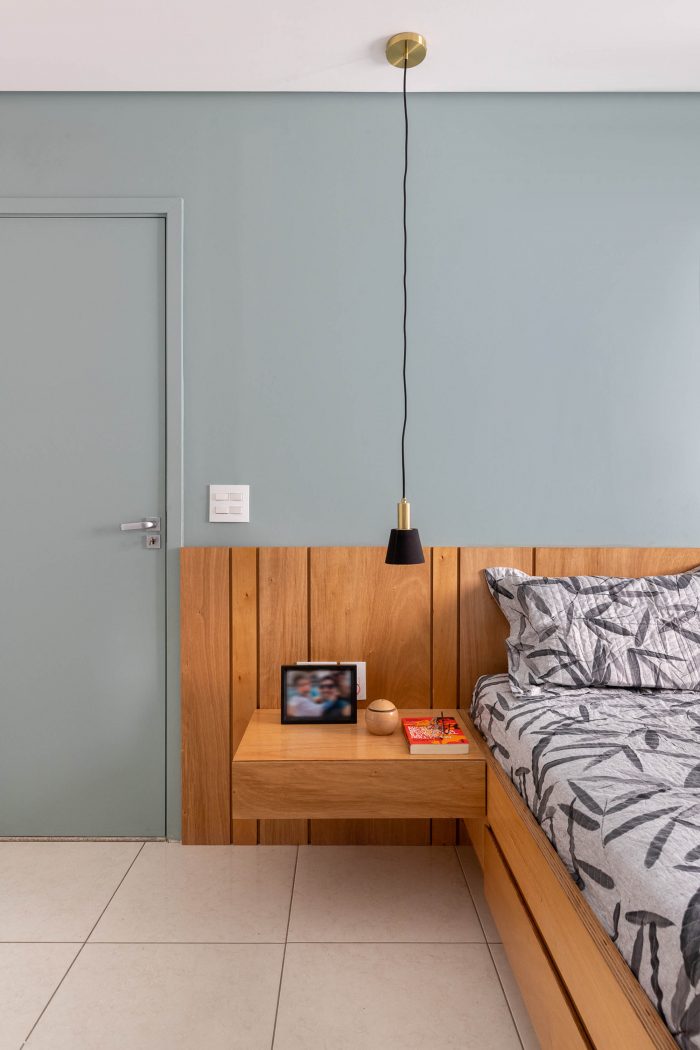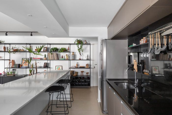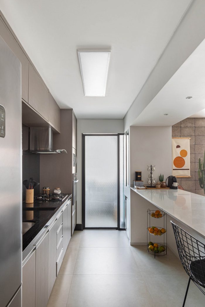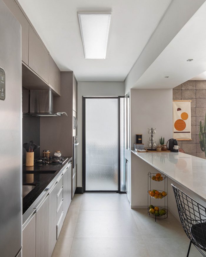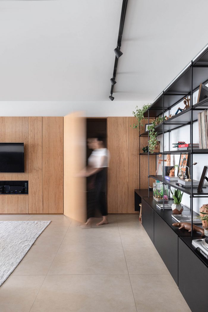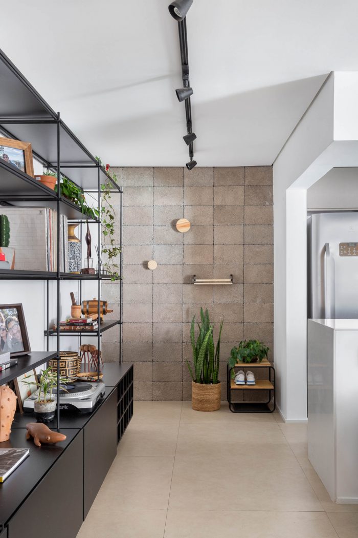 The materiality of the project was defined based on the existing elements: gray floor, black kitchen, white walls. From this initial base, we searched for elements that could reinforce visual sobriety, such as the walls of concrete blocks and the white countertop, in contrast to the wood of the main panel of the room - a multifunctional element that disguises the entrance to the rooms, stores dishes, tv equipment’s, swing net and other objects.