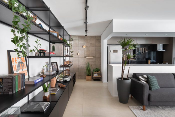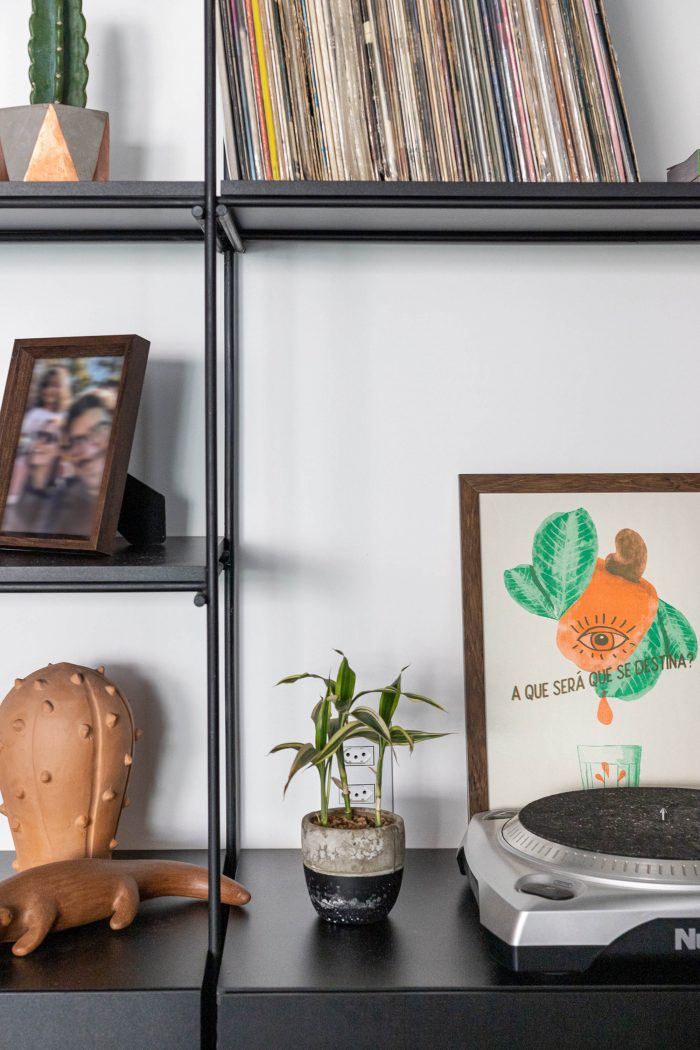 The expansion of the room allowed the positioning of the dining table next to the window, freeing up the space for the living room, which started to function as a space for socializing and leisure for the family, free from the movement of people. There, a large metal bookcase made of smooth rebars organizes and displays decorative objects, books, vinyl records, and plants, in addition, of course, to the daughter's toys.