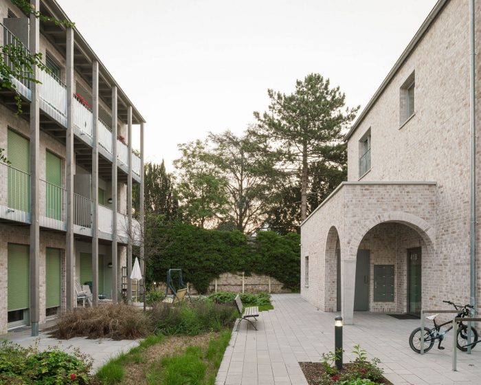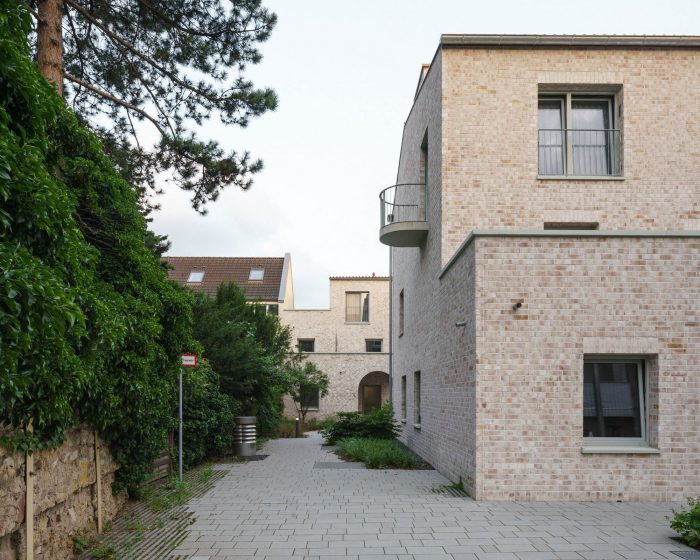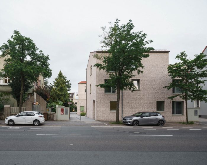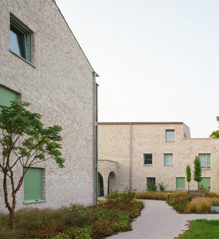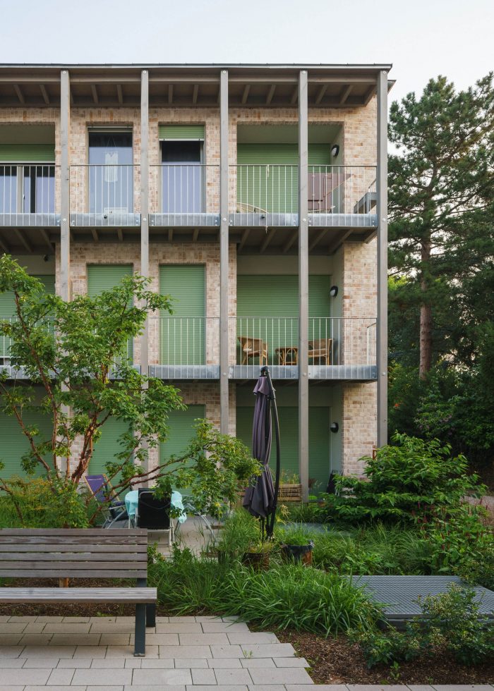 The grain of the new buildings is oriented towards the neighboring structures, especially the traditional courtyard buildings of Frankfurter Strasse. The clinker facades tie in with the surrounding surfaces of the residential buildings, the walls, and the old industrial buildings, such as the nearby old Opel plant. The neighborhood between the railway tracks and Verna Park is characterized by small individual houses built around 1900 for Opel employees in a dense structure of small city blocks. These buildings are still preserved today, partly in untreated brick. The courtyard-side stable and barn buildings with their wooden gates and wooden galleries form the model for the wooden construction of the southern balconies.