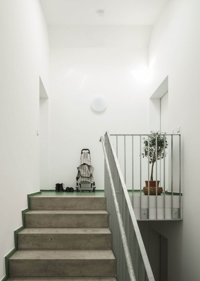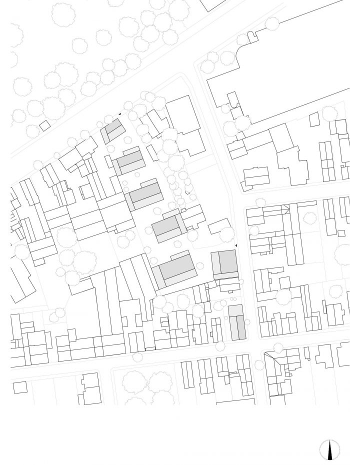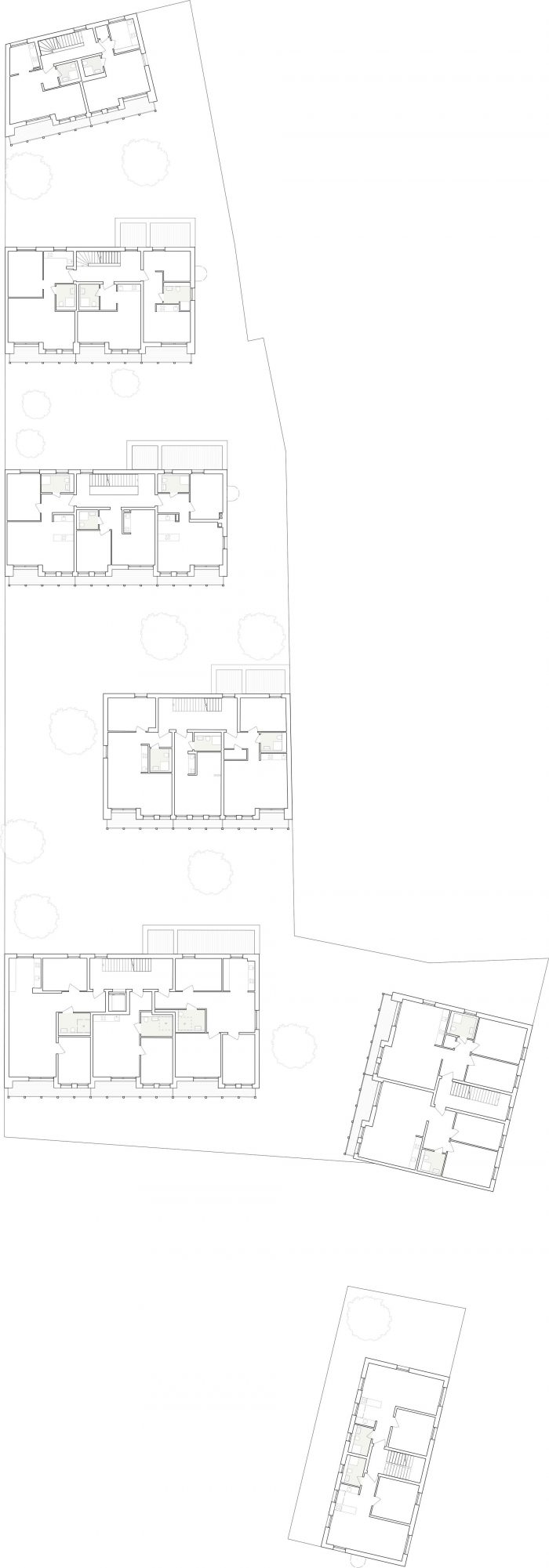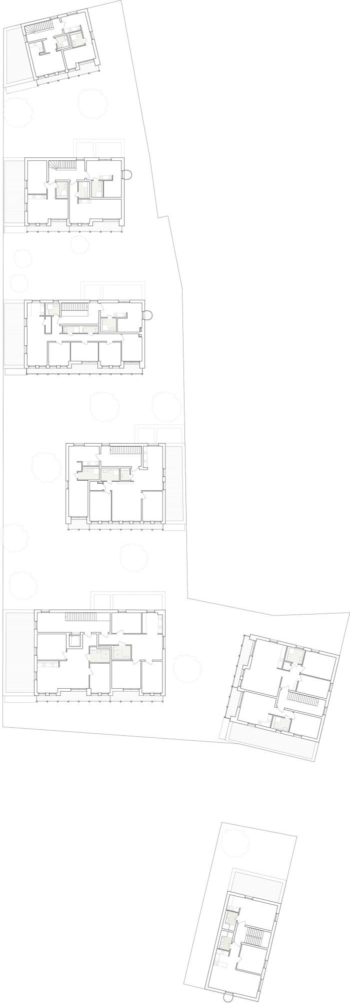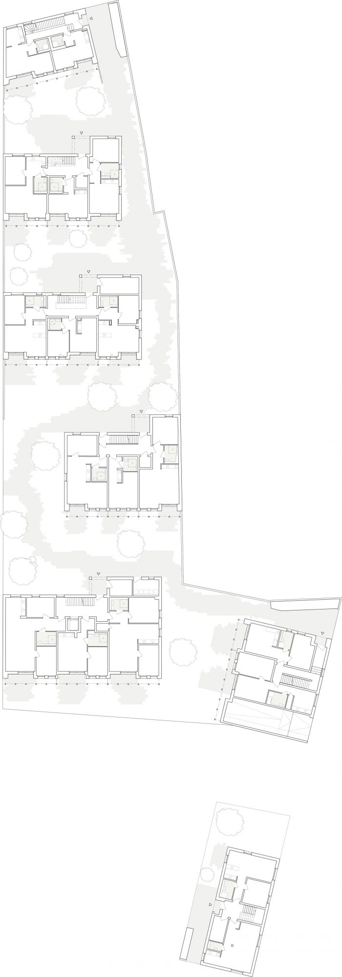 封闭的穿孔立面与公共道路相邻,而建筑则向南面大面积开放。在这里,每栋建筑前的木质架子提供了狭窄的阳台和深深的木廊。半公共绿地、铺设的休闲区和连接空间交织在一起,形成一个连贯的结构。这一概念得到了统一铺装面的支持,通过增加种植和草坪的连接点,创造了一个流动的过渡到绿色区域。深层地块的典型围墙也被保留和补充;这些围墙现在形成了公共通道的骨架。