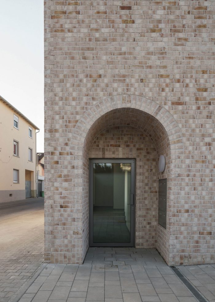 周边地区历史上的熟料砖的特点是苍白,部分是绿色的色调,现在已经没有这种形式了。为了将外墙嵌入到周围环境中,红砖用炭火烧制和浅色的釉面进行了提炼。定制的熟料砖被打碎成瓦片,用砂浆涂在外墙上。