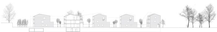 Closed perforated façades border the public path, while the buildings open up extensively to the south. Here, a wooden shelf in front of each building provides narrow balconies and deep loggias. Semi-public green spaces, paved recreational areas, and connecting spaces weave together to form a coherent structure. The concept is supported by the use of a uniform paving surface, which creates a flowing transition to the green areas via increasing planting and lawn joints. The typical wall enclosures of the deep plots were also retained and supplemented; these now form the backbone of the public thoroughfare.