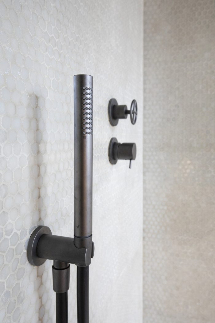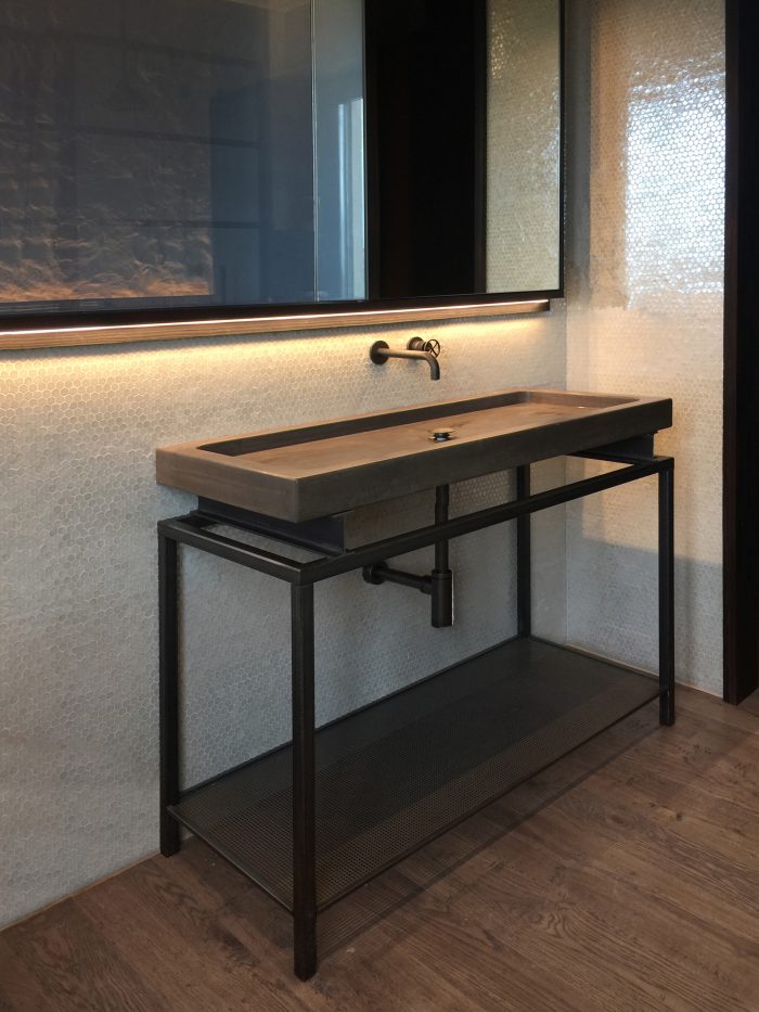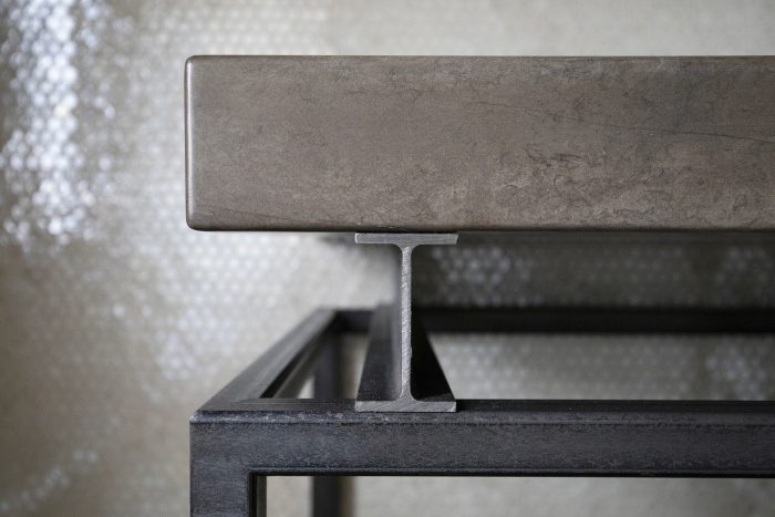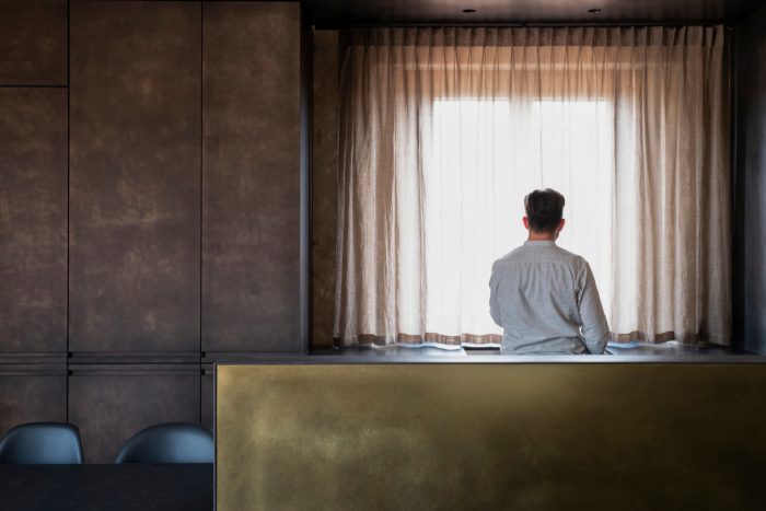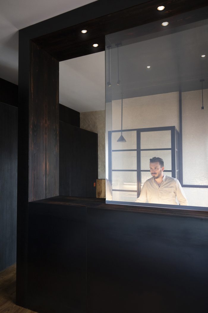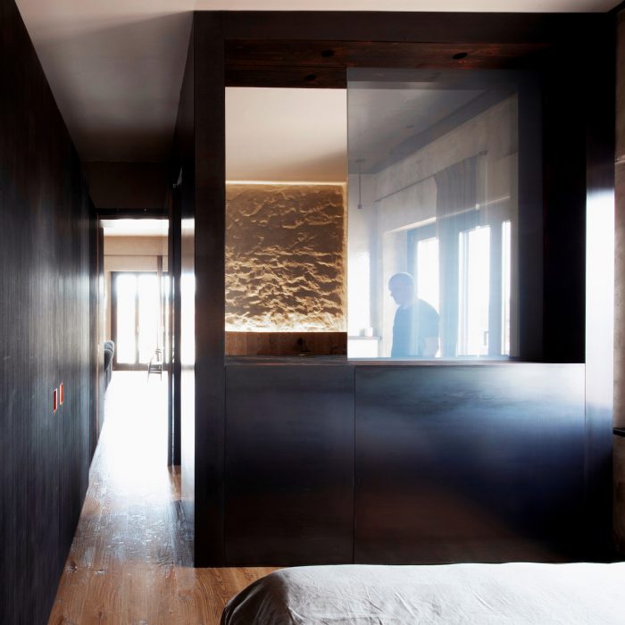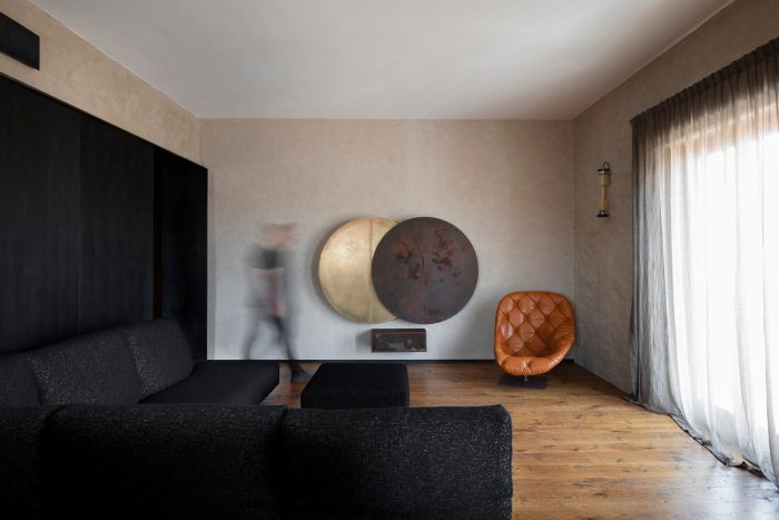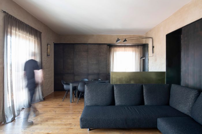 Other elements are characterized by a similar tendency to narratively break away with ordinary approaches and reinterpretations in architectural design: an iron gate structures the living back wall and contains a metal kitchen with burnished brass finishing touches. The false ceilings of the lowered parts are in black natural iron plates. Custom furnishings (tables, sinks, beds) are developed using industrial metallic profiles with visible joins.
