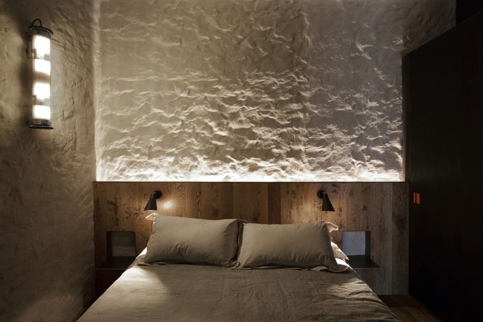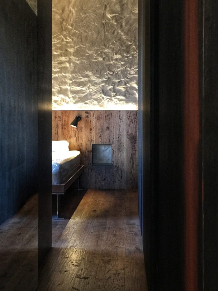 In the freed space, the brutal force of the stonework pushed us to radicalize the architectonic translation of the functional program. We did not build new walls within the space structured by the masonry. Rather, we compartimentalized the functional program inside new grafts-like devices. Thus, the original walls entered into an intense dialog with the new elements, which were crafted using highly authentic materials capable of engaging with the poetic roughness of the stone.