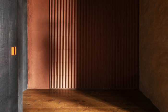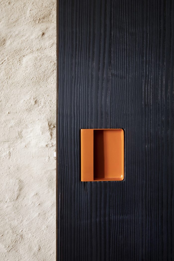 A pitch-pine boiserie(minium-colored and burnt) crosses the spaces from the lowered entrance down the living and slides along to constitute a side of the bedroom. Inside it, we find the guest toilet, the laundry room, and the bedroom wardrobes. The surface is uninterrupted and the otherwise indiscernible openings are marked only by some read-lead handles of our own design.