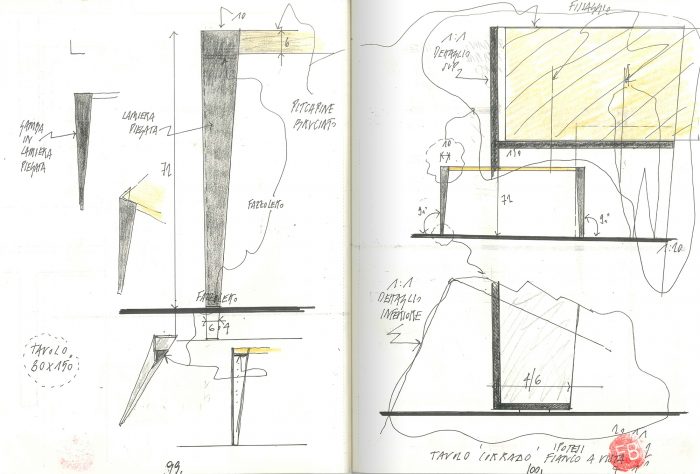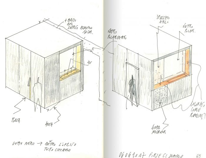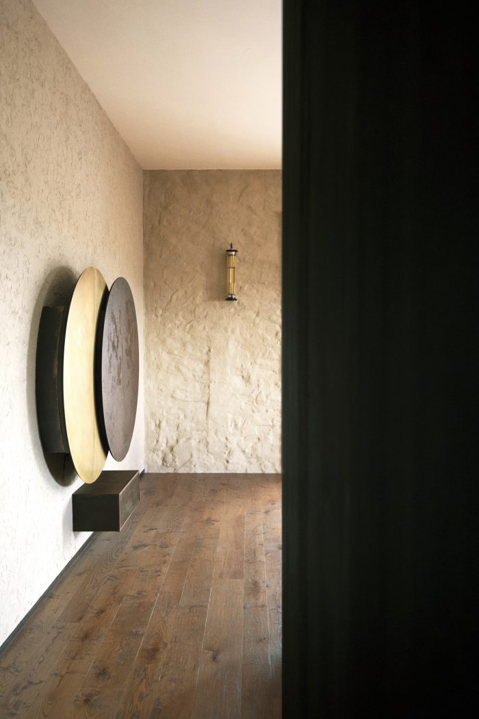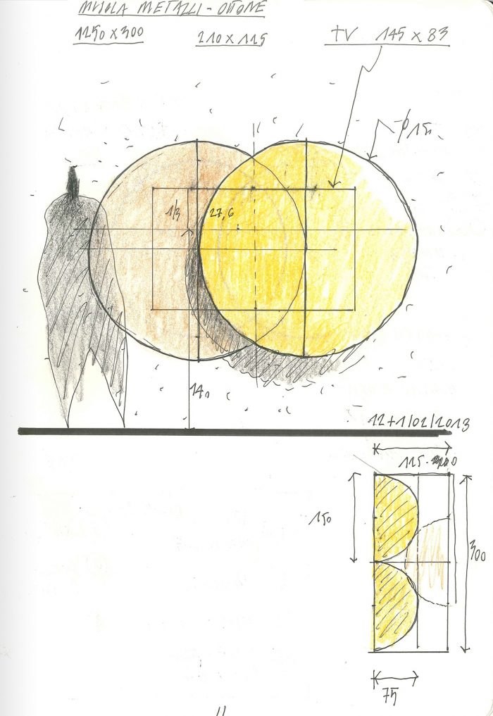 The host bedroom toilet is inscribed within a black, uncolored, sheet metal volume treated with shoe polish. The volume presents different ploys: towards the bed, a big opening is ambiguously divided by a mirror and a polarized glass, which can hamper or offer a voyeuristic view of the bathroom. Towards the bedroom, a piston-driven remote control allows a hide-away TV set to come on stage. Finally, the door is concealed by a mirror that renders the movement between the volume and the boiserie all the more enigmatic. The entrance wall of the living is marked by the iconic presence of two slightly overlapping circles. They were made using different metals (brass and aged iron). This device too aims to conceal the invasiveness of the TV. Upon manual operation, in fact, a sliding mechanism brings the TV screen into view.
