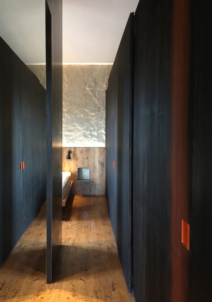 一条黑松木(迷你色和烧焦的)从低矮的入口处穿过空间,从起居室向下滑动,构成卧室的一侧。在它的内部,我们发现客人的厕所,洗衣房,和卧室的衣柜。表面没有间断,原本难以辨认的开口只用一些我们自己设计的读引把手来标记。