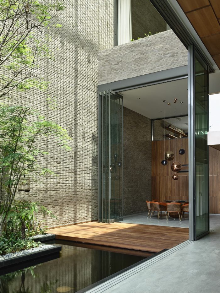 The house sits on a typical landed housing plot with an oncoming road directly facing the front and this becomes a privacy issue. To address this, a vertical court is inserted between the house and its adjoining neighbor. All the main spaces of the house look into this courtyard.