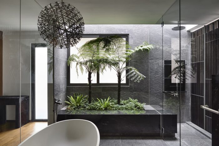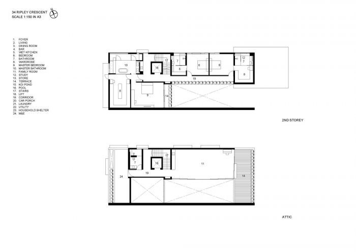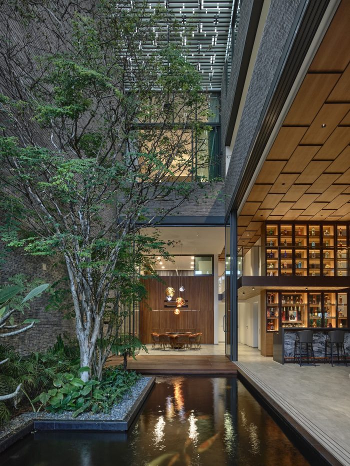 在地面上,有两个池子,在有顶棚的天窗花架下有一个锦鲤池子,延伸到外面的游泳池。双层的客厅和餐厅向这个庭院开放,相应的高大的滑动和折叠玻璃门可以完全打开。庭院的顶部覆盖着玻璃屋顶和阳极氧化铝花架的复杂图案。这为房子创造了一个完美的环境--避雨、遮阳、避人耳目,并通过前面的大开口通风。对于家庭和他们的客人来说,它是一个名副其实的绿洲。