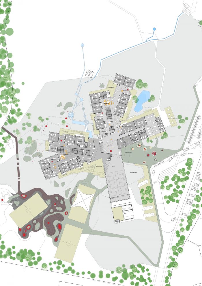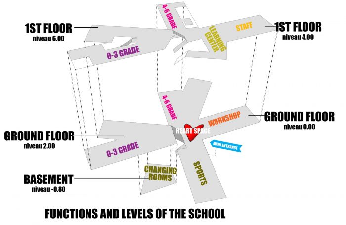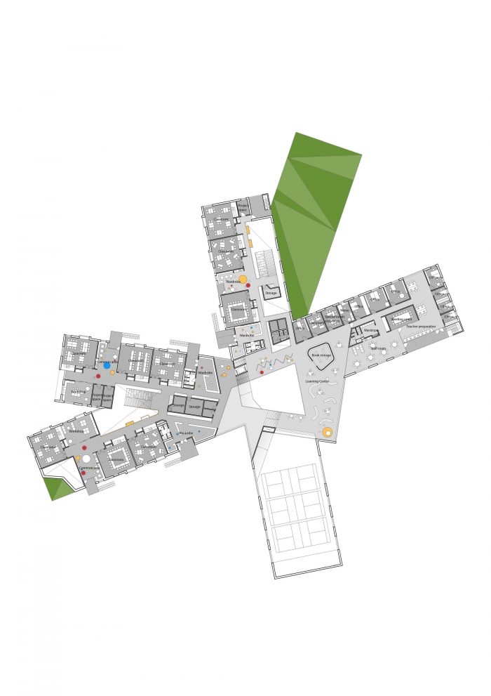 The ’heart’ room is a centrally located, dynamically shaped and a volumous space with a large multipurpose stair at it’s base. Additional stairs and platforms create and provide access to the learning center, views towards the large hall, and connection to both the teachers’ area and the core areas.
