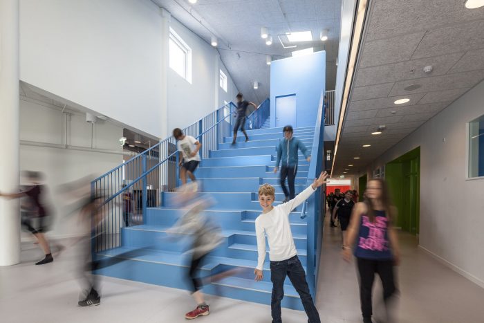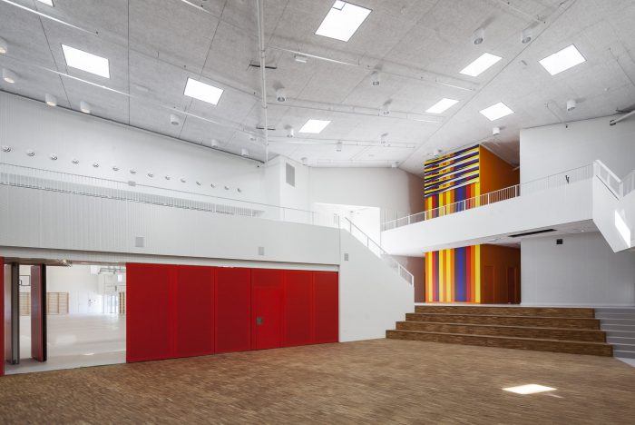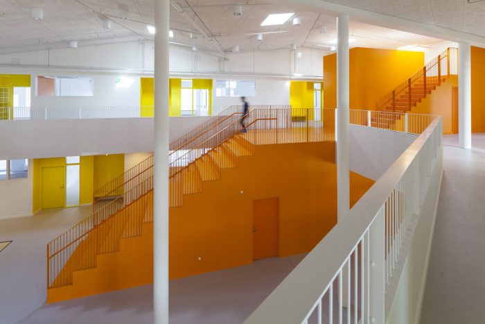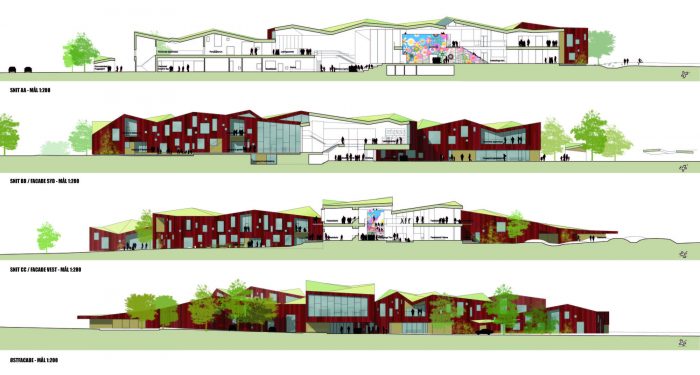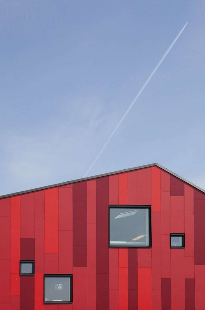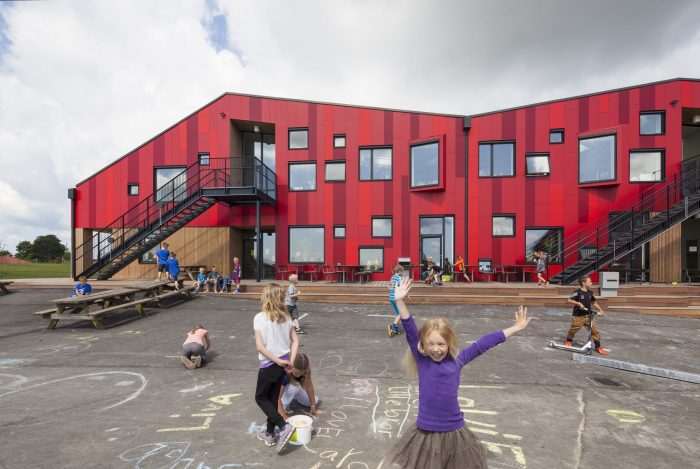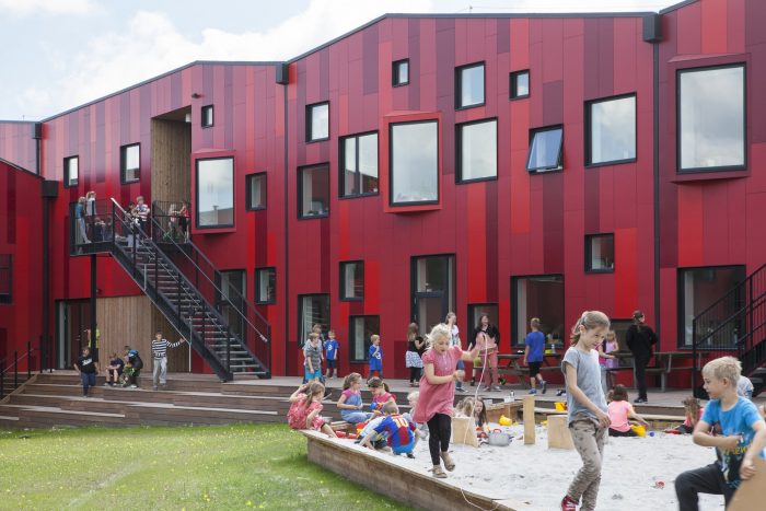 The school is characterized by its playful red facade, external educational zones and a roof that creates ideal opportunities for both the installation of solar panels and north-facing skylights. Elements that contribute to the school’s low energy status.
