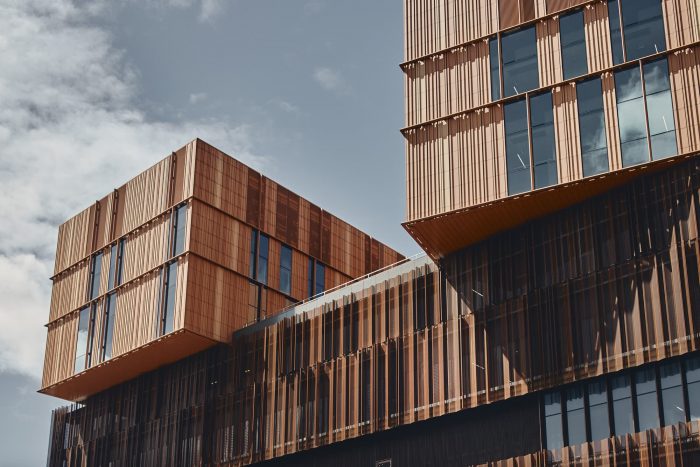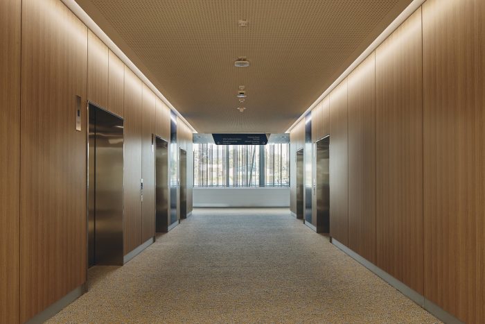 The carefully crafted interior palette incorporates natural timbers and earthy tones, drawing inspiration from the colors and textures of the surrounding landscape including the historic Matheson Tree – a grand 400+-year-old River Red Gum that stands proudly at the main entrance. The striking weathered steel façade establishes the Victorian Heart Hospital as a landmark building on the Monash campus, while gently nesting within the tree-lined landscape and providing protection from the sun.