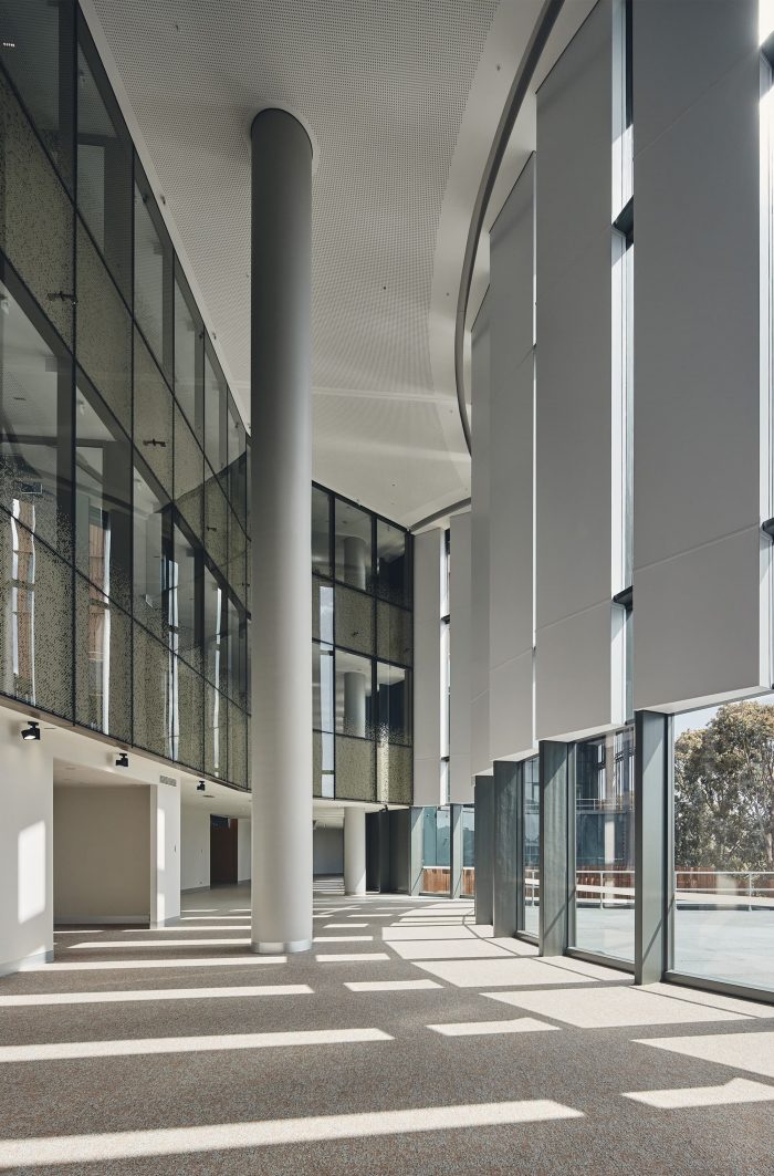 The public spaces of the hospital radiate out from the circular form of the courtyard, in counterpoint to the rectilinear planning elsewhere. Circulation corridors, both public and clinical, frame views of the courtyard, along with the neighboring university sports fields and the Dandenong Ranges beyond, enhancing visceral connections to nature and daylight. The Victorian Heart Hospital incorporates lessons learned from other major international heart hospitals and pushes the boundaries of conventional hospital design. Key members of the design team, with Monash Health, visited cardiac hospitals in Singapore, Canada, the United States, and the United Kingdom, for insights into the successes and shortcomings of these facilities.