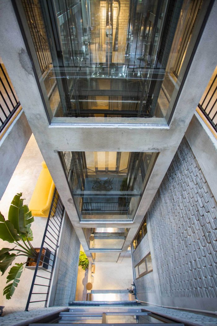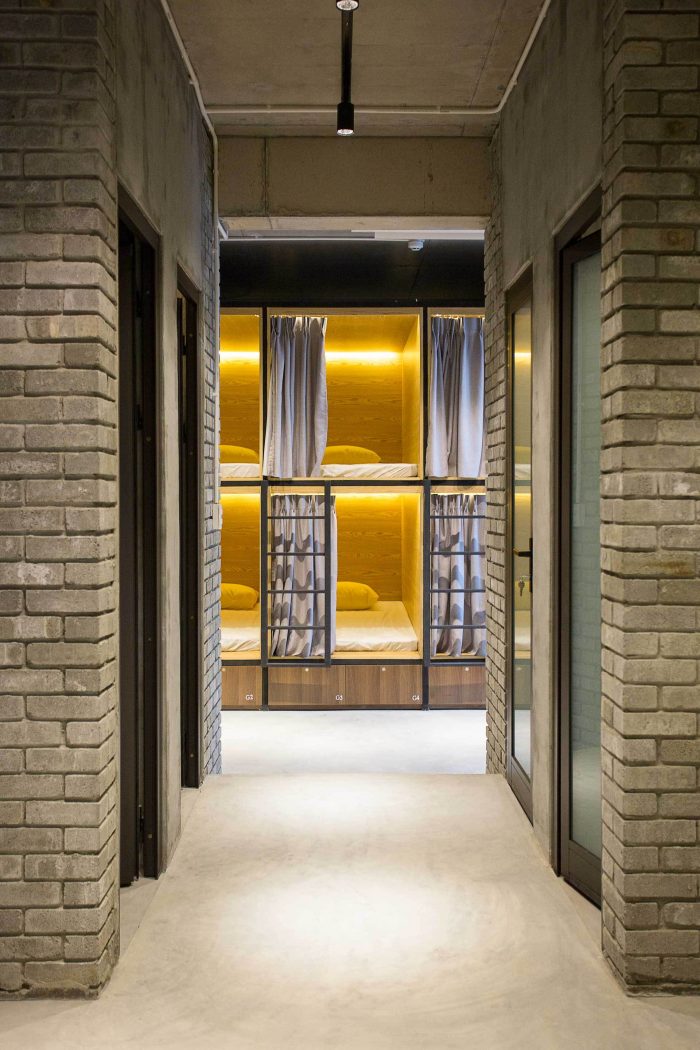On the 1st floor: We pushed back the whole building back to the back to reserve a space for parking and garden to isolate the riotous noise of the Han Market and the streets. In addition, the area is used to enjoy coffee and watch the streets. Inside, the reception area is one side. The rest is used to make restaurants and coffee shop to serve both the guests of the hostel and frequent guests. The back of the building is office and garden. Elevators are designed with glass to provide a spacious and airy feeling.