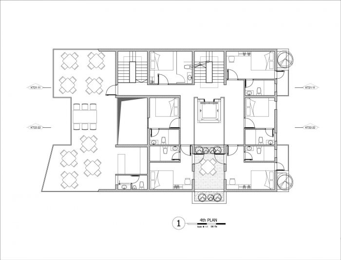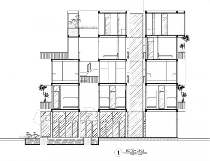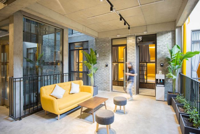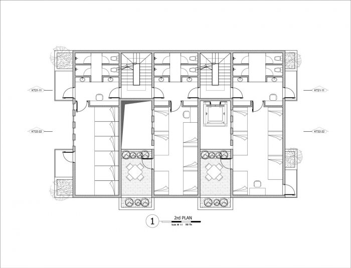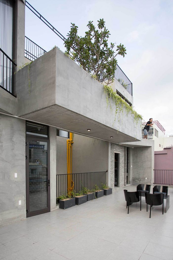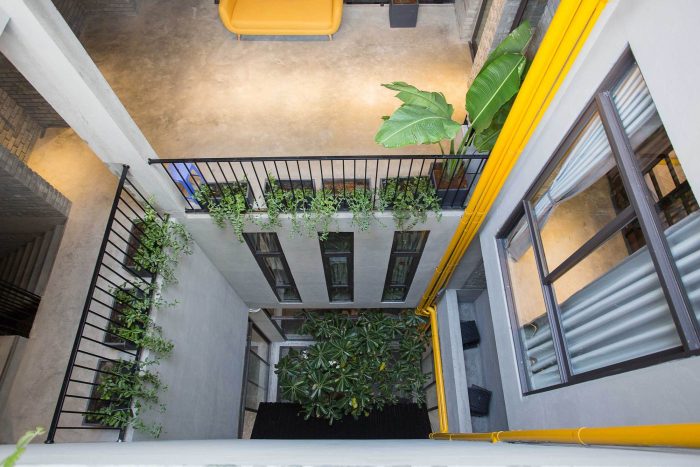 On the 2nd and 3rd floors: They are the beginning of the residence floor, including the Dorm rooms. Between the rooms is a well and the space has green trees, people can walk to these areas to work, relax, talk, and smoke comfortably without disturbing the other on the inside.