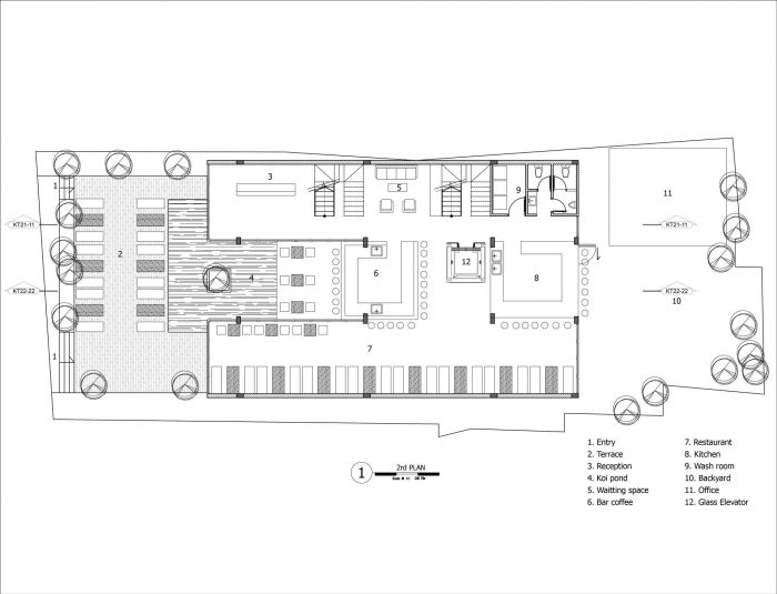 在1楼。我们把整个建筑推到后面,预留了一个停车和花园的空间,以隔离汉字市场和街道的骚乱噪音。此外,该区域被用来享受咖啡和观看街道。在内部,接待区是一个侧面。其余的部分用来做餐厅和咖啡馆,为旅舍的客人和常客提供服务。建筑的后面是办公室和花园。电梯是用玻璃设计的,给人以宽敞和通风的感觉。
