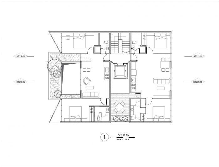 On the 5th floor: We designed two apartments. Why do we do that? There are two reasons: firstly, this land is rented for construction, so the owner needs a financial security plan. If we construct the apartment above, it is very easy to rent for a better price than the Hostel. Secondly, due to the demand for tourist apartments in this area is very large, however, the surrounding area is not enough to serve.