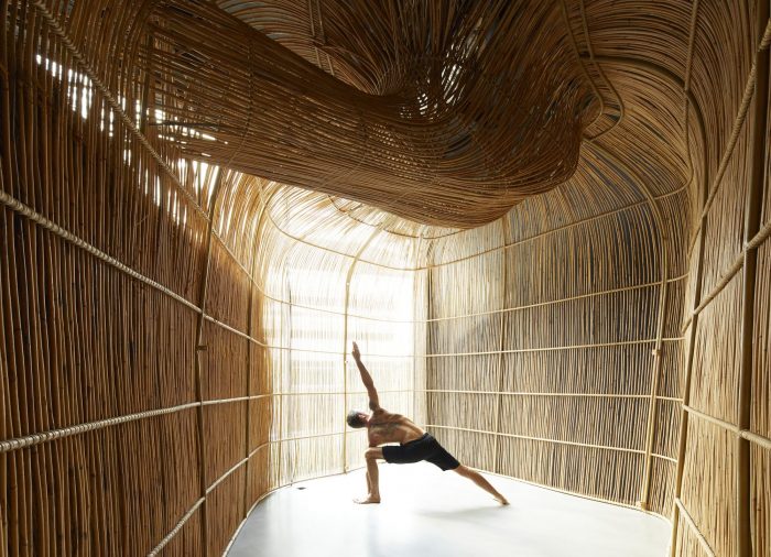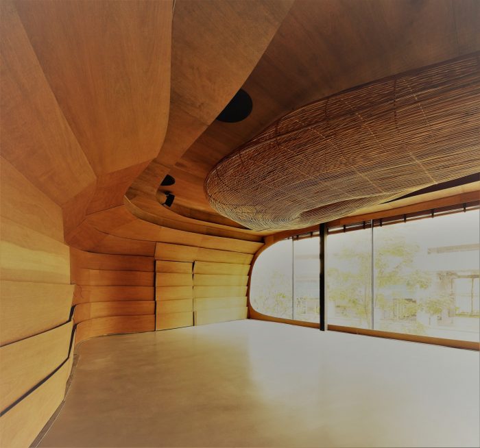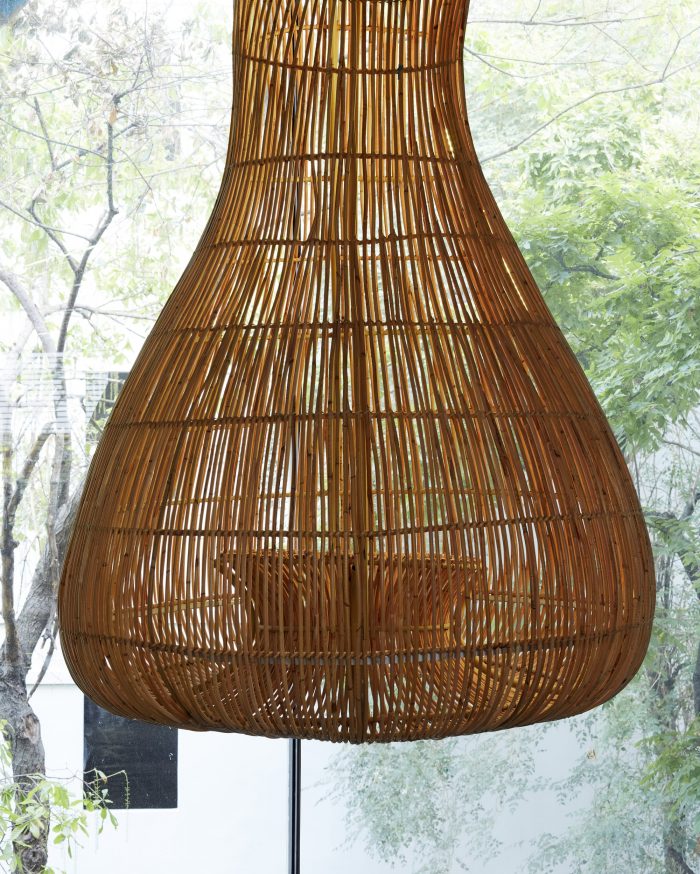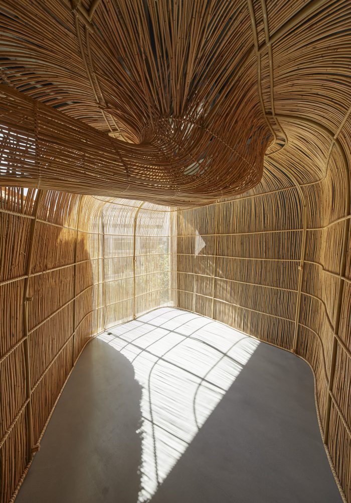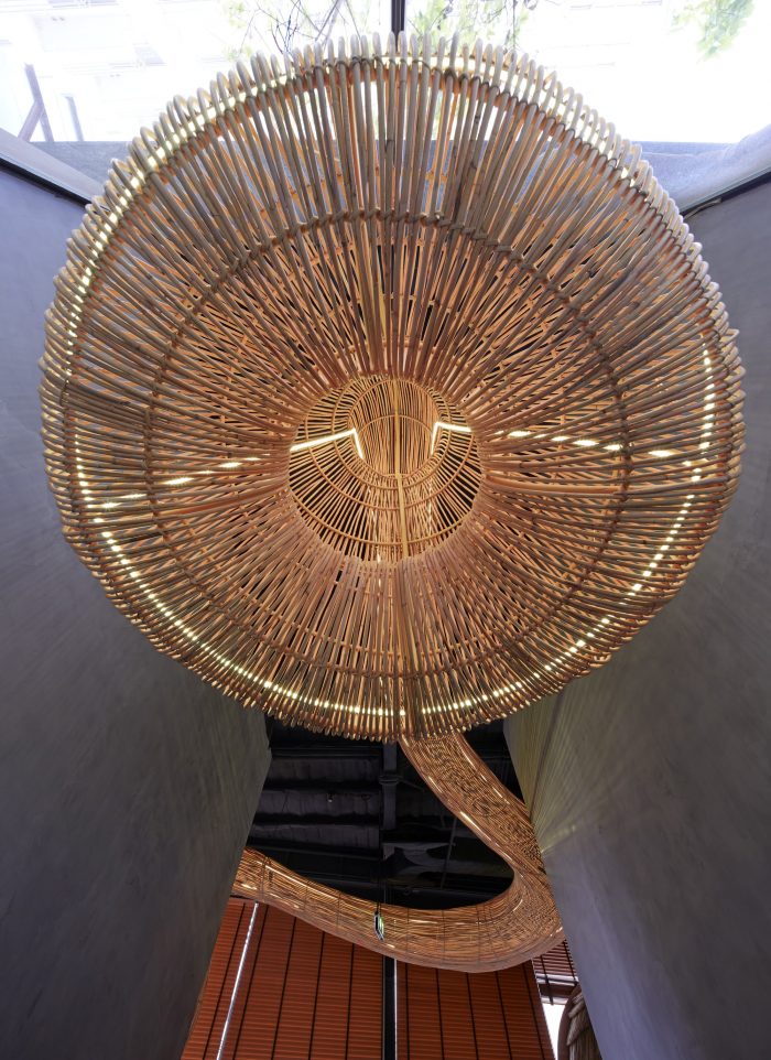 Using their signature geometries, Enter Projects Asia facilitated the fusion of 3D technologies with local Thai craftsmanship to bring nature to an urban context. All elements of the project were made from natural, local materials: Thai hardwood, rattan, palm leaves and local black slate.
