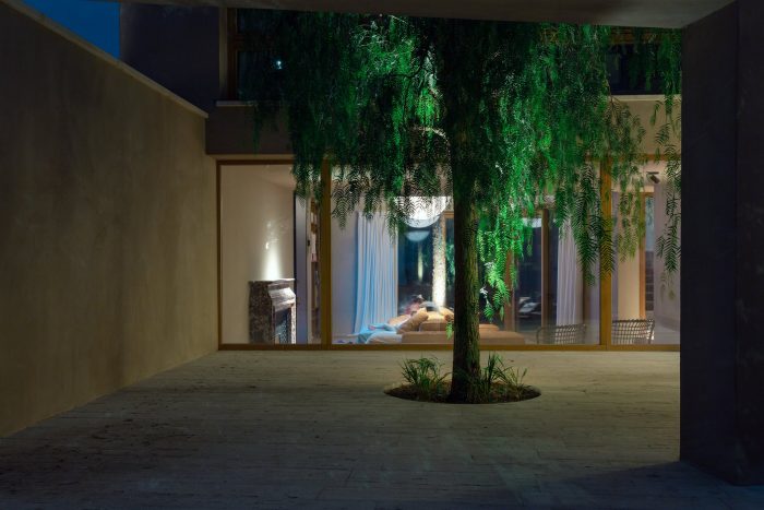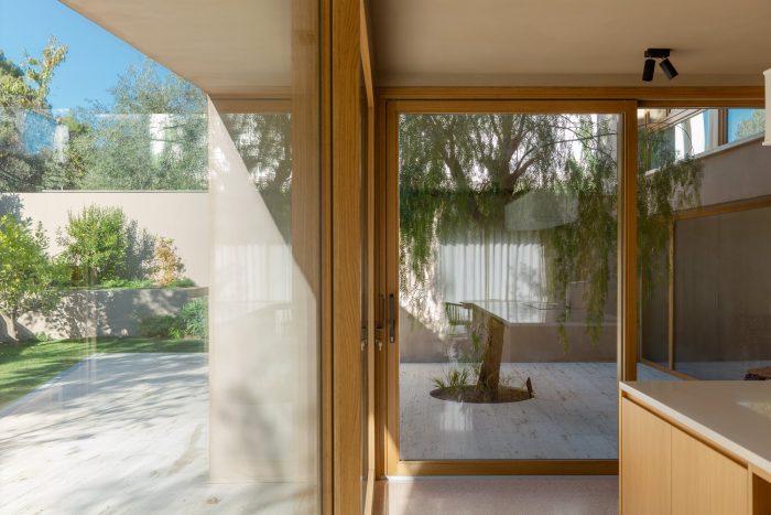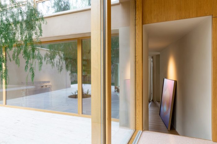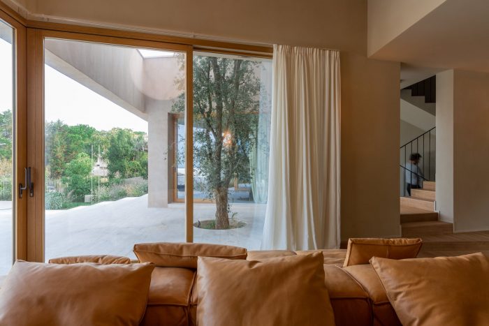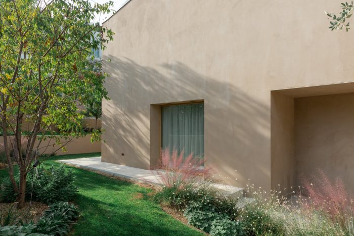 The volume is excavated on the north-east front, becoming the main entrance of the house, while on the north-west side, a smaller excavation of the volume defines the secondary entrance. The volume extends itself to the south over the kitchen space, creating a shaded area, while the southwest courtyard defines the perimeter of the outdoor garden.