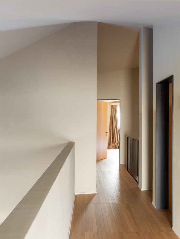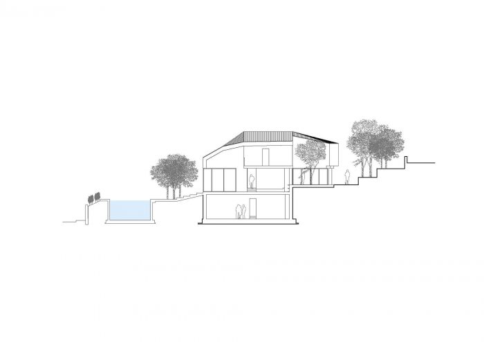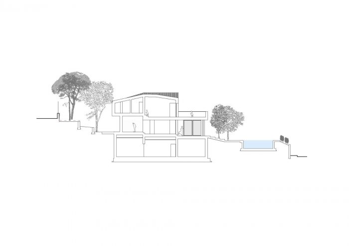 Raumplan. We wanted to take advantage of site peculiarities like the sweet slope of the hill, making it part of an experience to be lived inside the house. Here the idea of the “raumplan” is intended as internal environments placed on different quotes, according to the 'land's natural slope axis, generating a continuous relationship between interior and the external spaces.