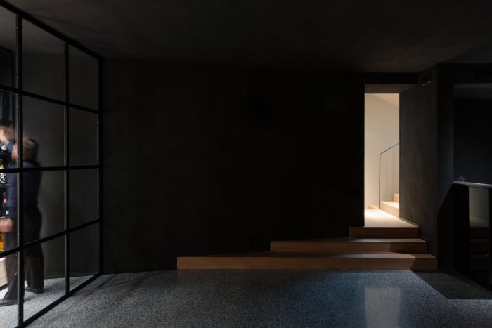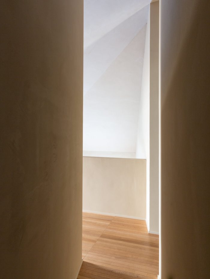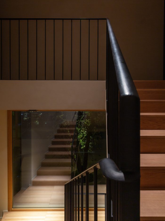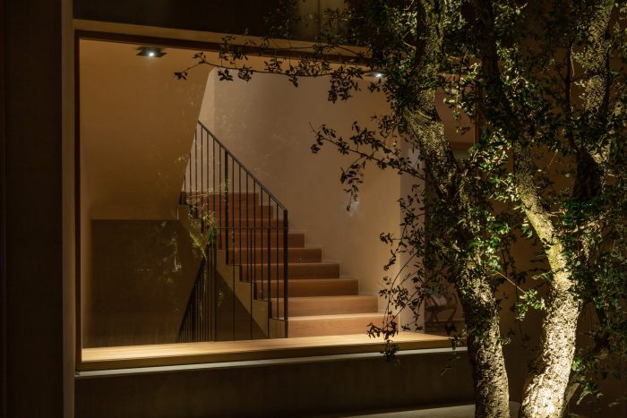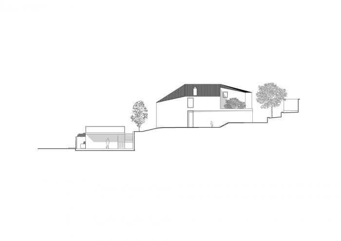 院子。位于下游主立面的东北院子成为客厅、书房和中央楼梯之间的关系空间;这里将在可渗透的表面上种植观赏树。在另一部分,西南院子是房子角落的一部分,靠近客厅和厨房,这个空间被认为是一个庇护所,一个可以插入观赏植物和创造阴影区的表面。