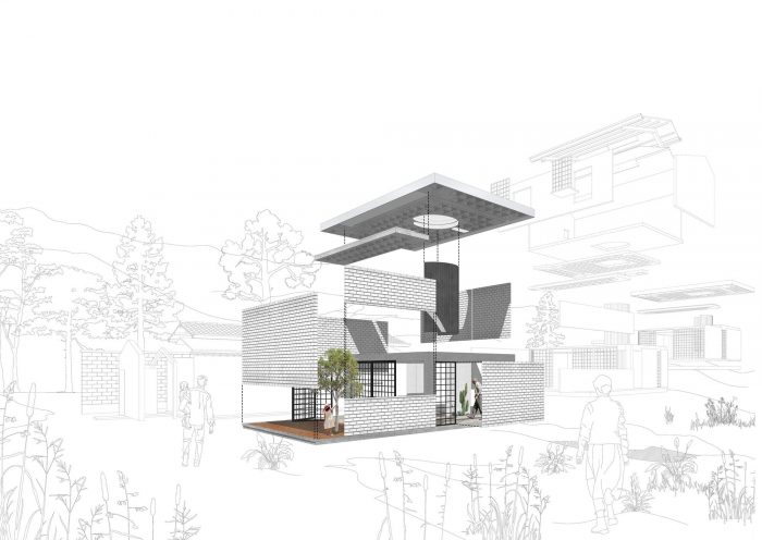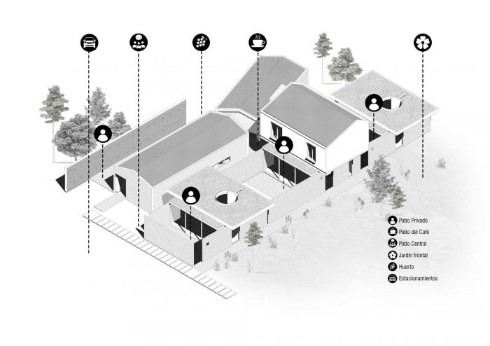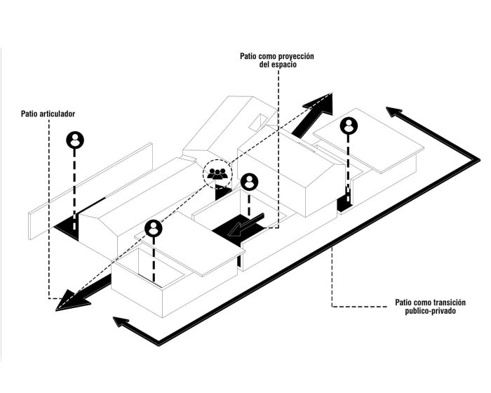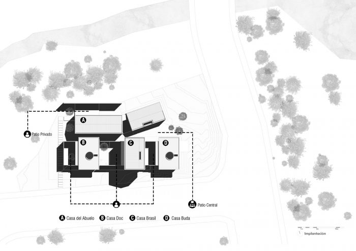 Three types of patios with particular characteristics and intentions; the private, present in each unit, surrounded by masonry or landscape on three sides and, projected towards the personal space by just one of its planes; the common courtyard, created by the arrangement of volumes, with 2 parallel planes first and then tangent, projected onto the landscape, planes with discreet openings that prudently anchor them to the private space; and, the most modest of all, but essential, a void attached to the common patio on the geometric axis of the project, with three planes sharing space with the grandfather's house and, one arranged towards the center, the coffee patio, the common place where the family will gather.