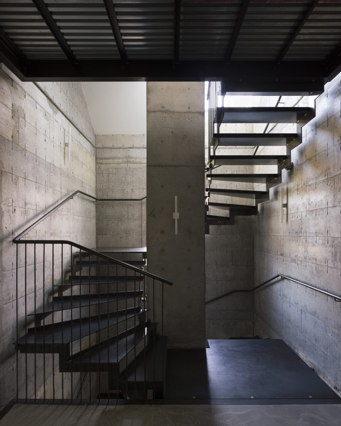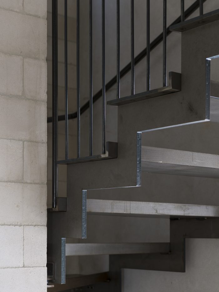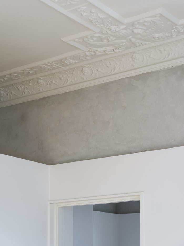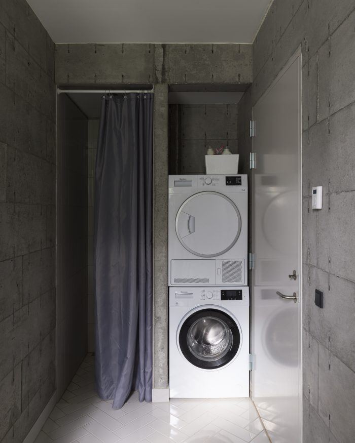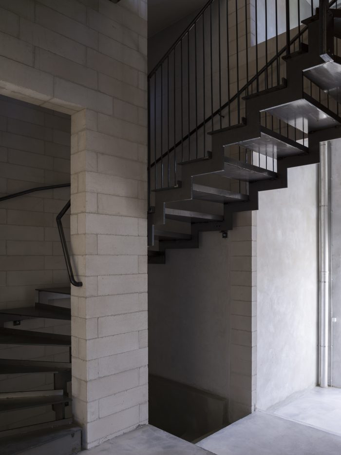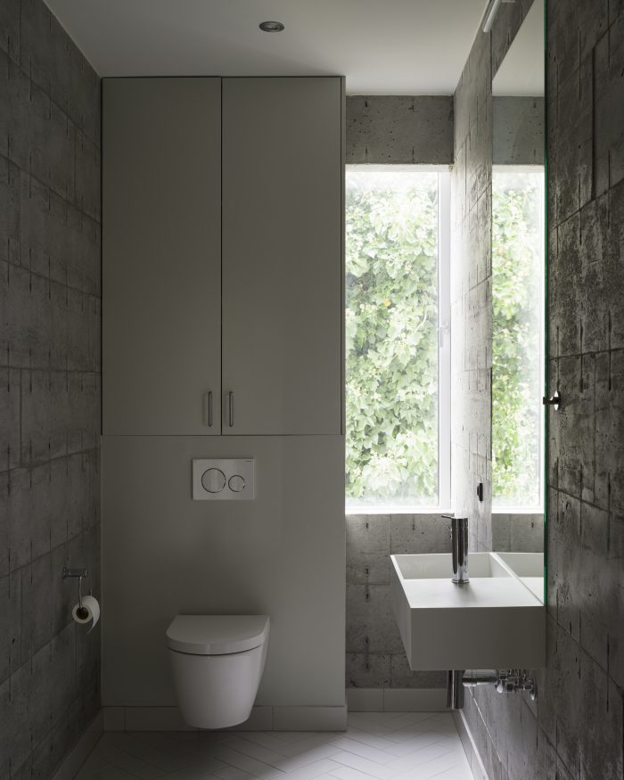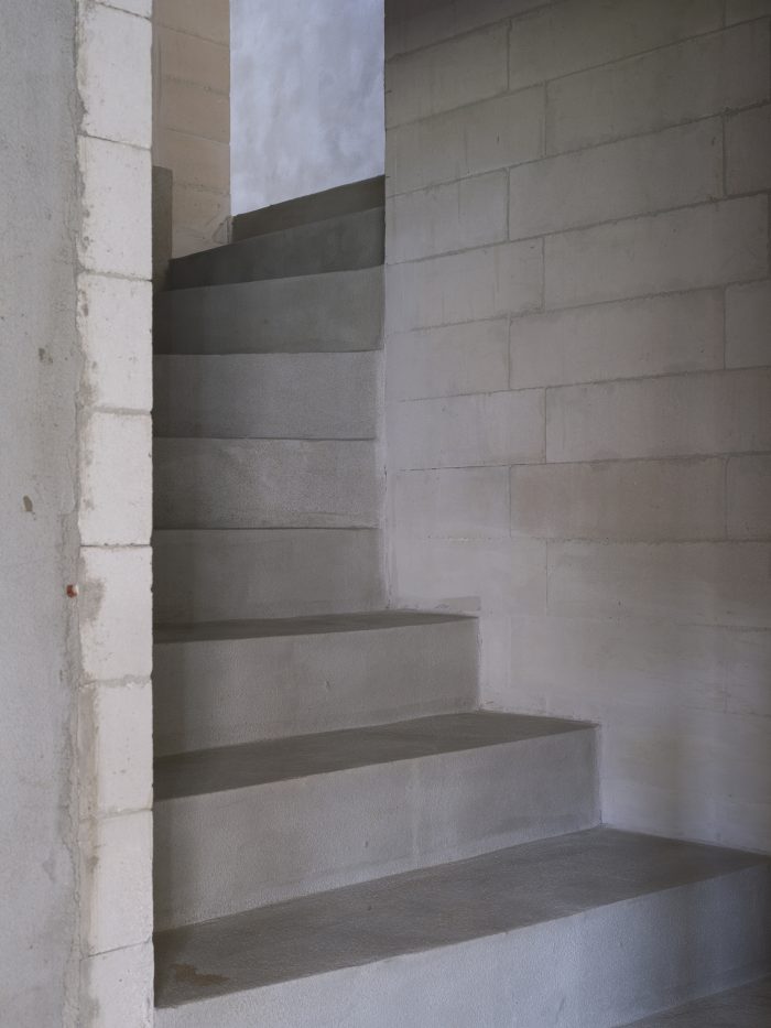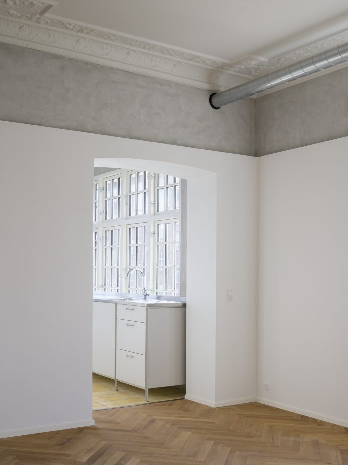 In the stairwell, calcium silicate blocks reinterpret the classical masonry while the stairway itself is made from laser-cut steel plates reflecting the contemporary potentials of craft. The interposed wet rooms – like the insulating partitions – do not take advantage of the entire ceiling height. This allows the stucco to show the original dimensions of the rooms as a testimony to Villa Landluft’s ceremonious past – placed pragmatically alongside galvanized ventilation pipes.