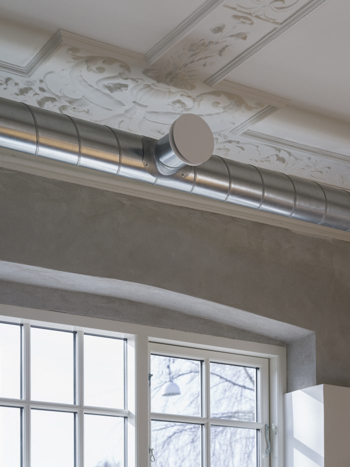 在楼梯间,硅酸钙砖重新诠释了古典的砖石结构,而楼梯本身是由激光切割的钢板制成的,反映了当代工艺的潜力。中间的湿润的房间--就像绝缘的隔板--没有利用整个天花板的高度。这使得灰泥可以显示出房间的原始尺寸,作为兰德鲁夫特别墅过去仪式感的见证--与镀锌通风管道一起务实地放置。