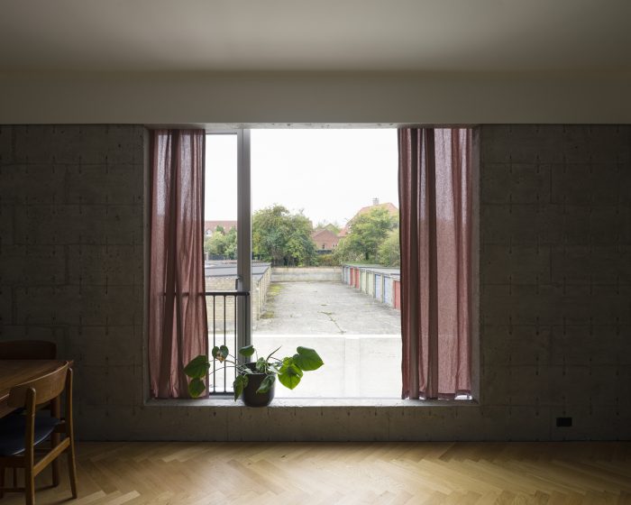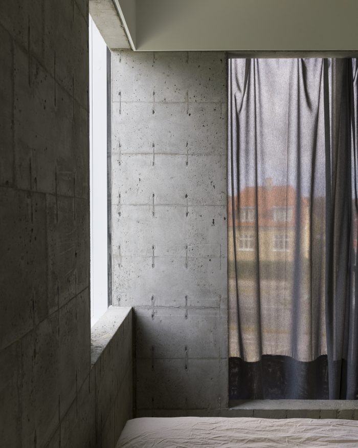 Each floor has two three-room apartments that mirror each other across a central axis. In each room, Villa Landluft’s stucco is subtly reinterpreted as a functional cassette system, which contains a thin sliding rail for curtains and wall decoration. The windows are mounted outside the concrete framework, making the openings appear as sharp cuts in the concrete planes when viewed from the inside. They reveal sections through the building’s exterior walls and expose the anatomy of Villa Landluft II.