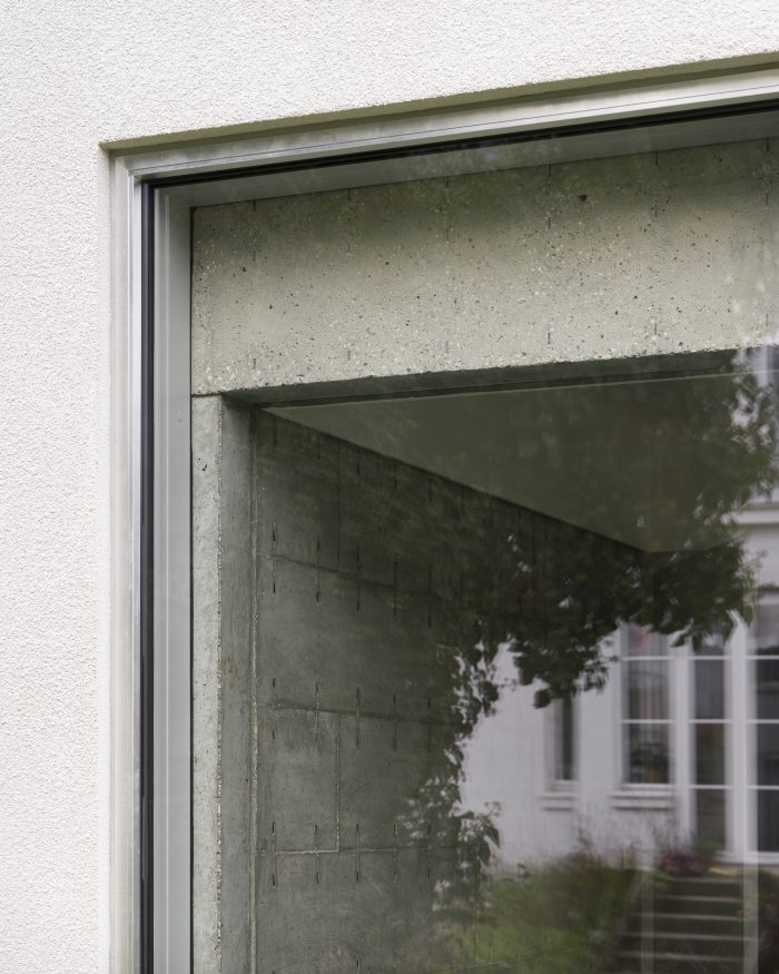 Villa Landluft II mirrors Villa Landluft as a contemporary interpretation of a mansion. The proportions, the symmetry of the dormers, the rhythm of the windows, the distinctive cornice, and the subtle frieze all refer to Villa Landluft’s architecture. Inside, the cast-in-place concrete structural framework appears exposed, making the formwork’s imprint materialize as a sensuous element. The raw concrete surfaces reveal the tectonics of the building and convey the construction of the house.