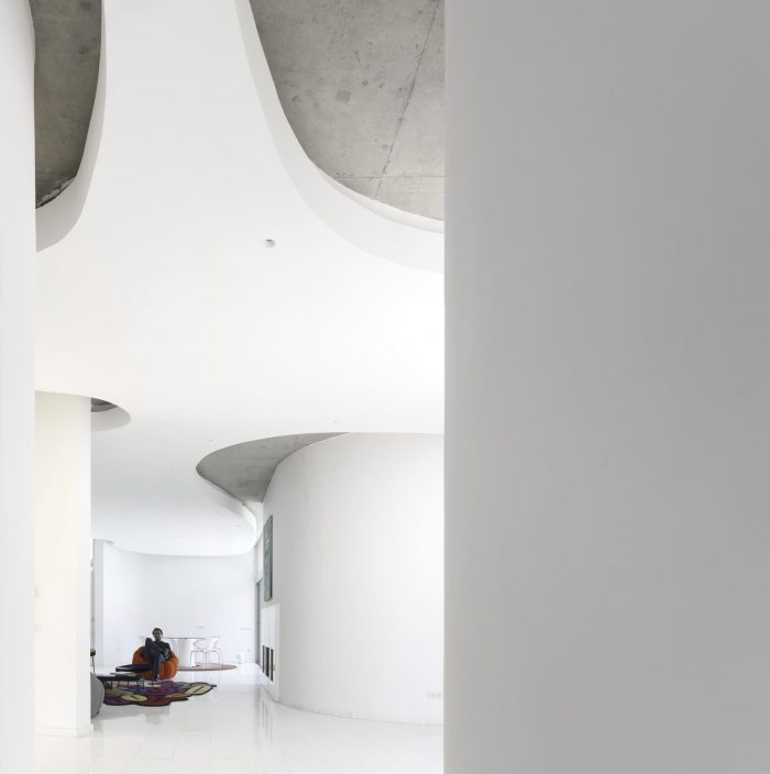 The project is located in a residential area in North Casablanca on a plot of 1000 sqm. The buildable area was spanning over a rectangle of 20x15. The client who is an artist wanted to have a house with curves, sensual lines, thin yet discreet, protective without being stifling, and many other constraints that defined the house’s architectural approach.