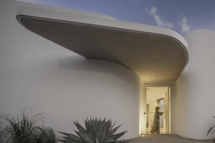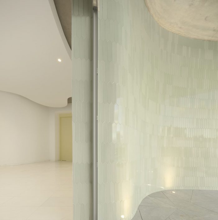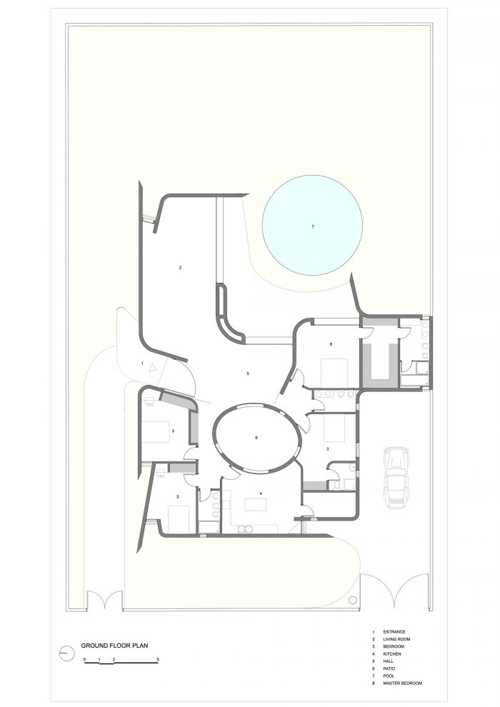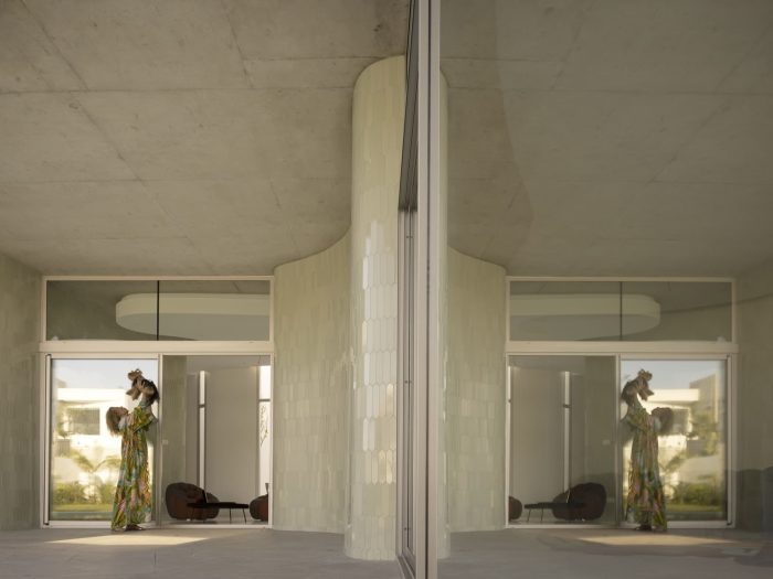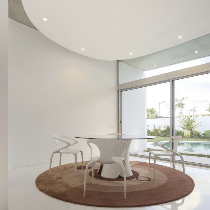 An organic plaster ceiling was designed to poetically cover technical features while preserving the authenticity of the concrete slab. The living room, dining room, and master bedroom wrap around the circular swimming pool. It gives the illusion of a second courtyard where the reflection of the house is drawn. Between the whiteness of the walls and the gray of the concrete slab, two walls are covered by light green ceramic tiles to create a poetic link between water and sky