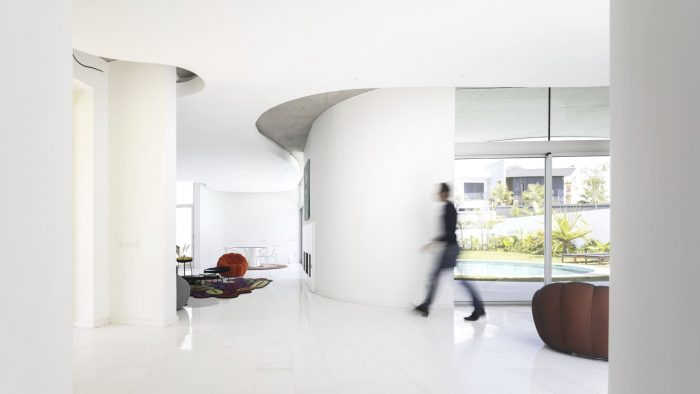 一个有机的石膏天花板被设计为诗意地覆盖技术特征,同时保留了混凝土板的真实性。客厅、餐厅和主卧室环绕着圆形游泳池。它给人一种第二个院子的错觉,房子的倒影在这里被画出来。在墙壁的白色和混凝土板的灰色之间,有两面墙被浅绿色的瓷砖覆盖,在水和天空之间创造了一种诗意的联系。
