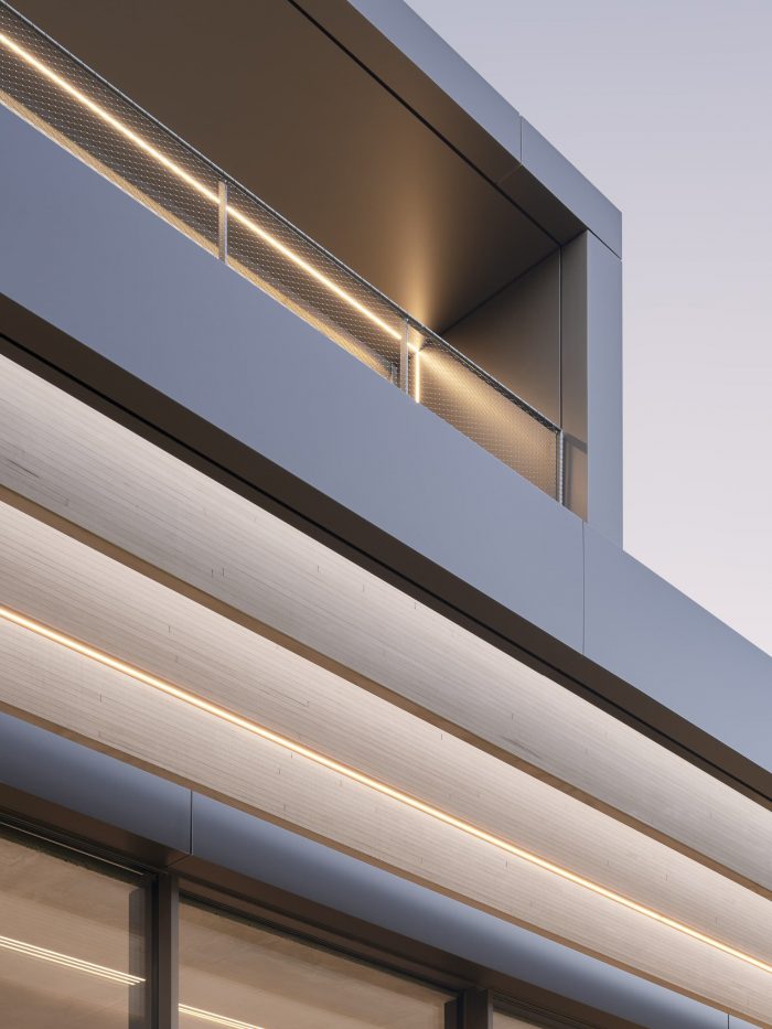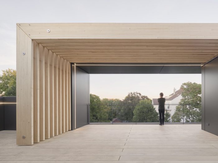 The north facade, oriented towards the garden on the courtyard side, was deconstructed and restored in a modern form. Wooden slats, projecting alcoves, and balconies characterize the new visual appearance. The roof was rebuilt in the established geometry using generous glazing onto the roof garden, which was created as an attractive outdoor space by recessing the roof space. A staircase was added to provide access to the garden from the ground floor level.