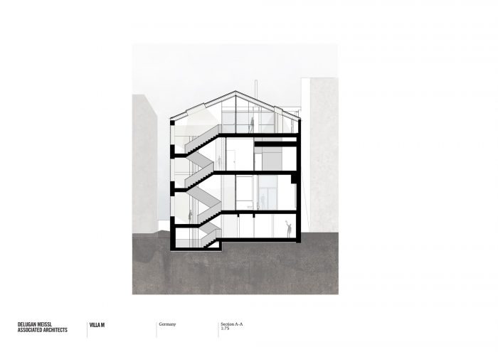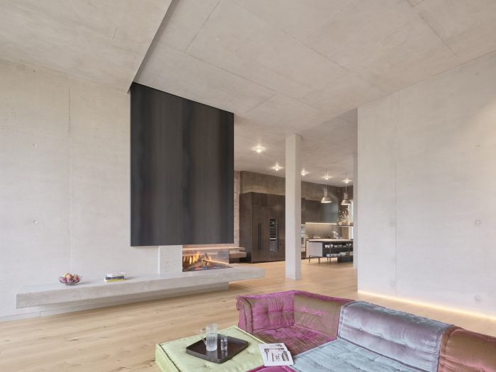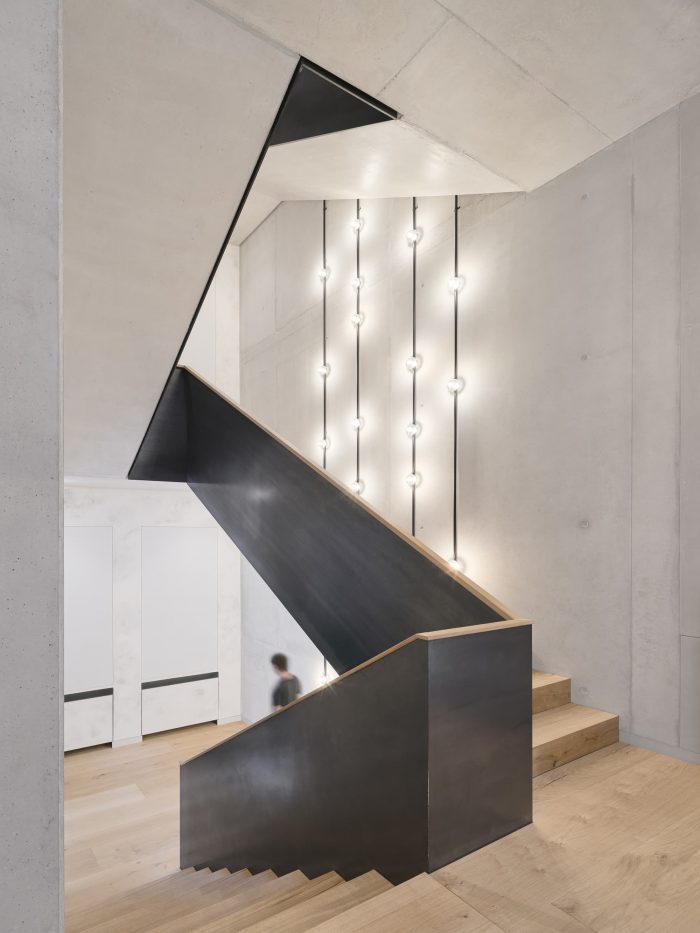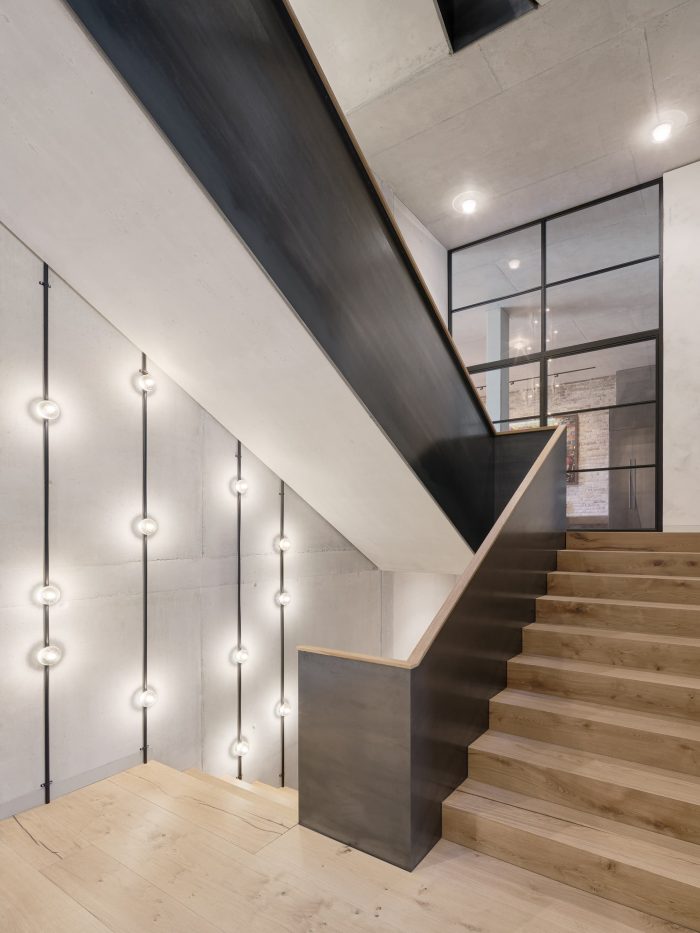 Upon entering the house through the historic entryway, the imposing open staircase immediately draws attention. High-exposed concrete walls, intriguing light installations, and a full raw steel railing introduce the industrial look that was consistently implemented throughout the house. Elegant floor-to-ceiling steel loft doors emphasize the characteristic original heights of the ceilings, which were retained after the existing building was largely gutted.