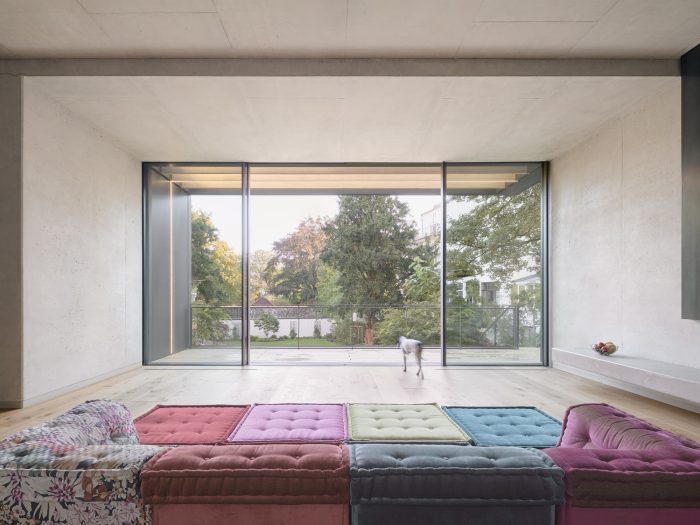 The use of tactile exposed concrete surfaces and warm wood floors emphasizes the loft-like industrial character on the ground floor as well, where individual rooms have been combined to create a spacious living and dining area with a kitchen. Floor-to-ceiling glass windows, fronted by generous outdoor spaces, draw the greenery of the garden indoors.