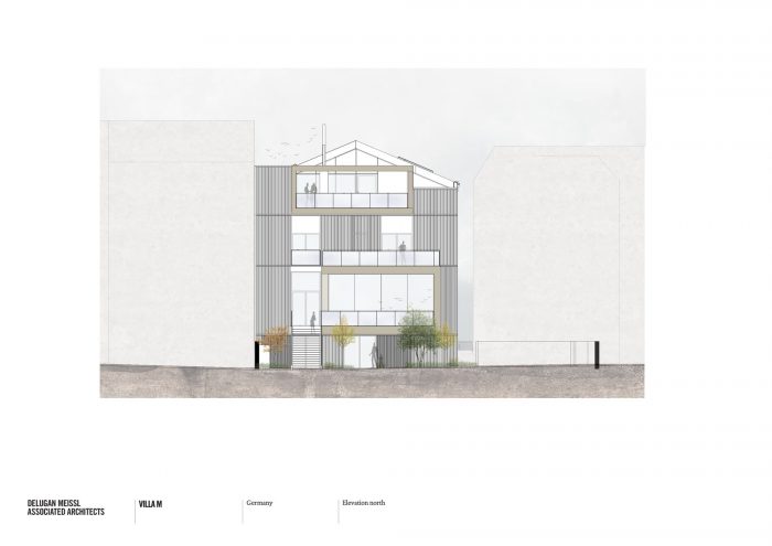 北面的立面,朝向庭院一侧的花园,被解构并以现代形式修复。木板条、突出的凹槽和阳台是新的视觉外观的特点。屋顶是按照既定的几何形状重建的,使用宽敞的玻璃窗,向屋顶花园照射,通过凹陷的屋顶空间创造了一个有吸引力的户外空间。增加了一个楼梯,以提供从底层到花园的通道。