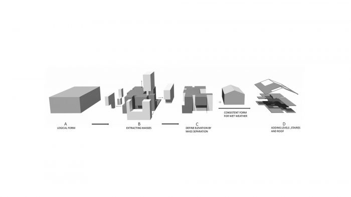 Because of the same dimensional and areas of the site, we chose a cube form with equal dimensions and same areas for all units, considering climate affection that change the flat roof of cube to the sloped one. Producing negative spaces considering affection of functional planning of project could be one of the best answers for creating alternatives with various spaces and interior circulations meanwhile keeping up the originality of basic form. Actually our target was producing the same units including various spaces with variety and view to the sea and surroundings. This approach helped us in creation of various negative spaces.