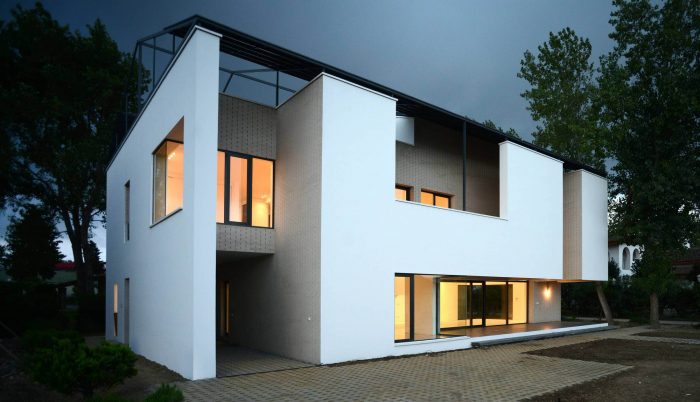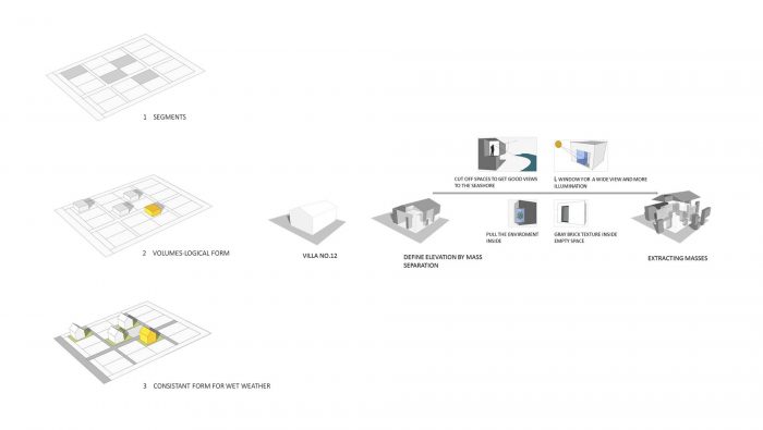 Next level was designing villa No.12, according to mentioned items in previous paragraphs, we started creation negative spaces in different alternatives. Many basic factors lead us to extract the negative spaces and reach to the final form after many revisions. These factors are, locating the main and secondary terraces, the view and perspective toward surrounding environment and vicinities and the way of lay outing required spaces.