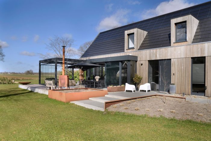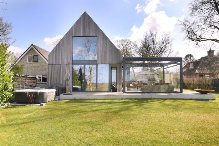 The Frisian landscape is characterized by forests, ditches, lakes, and vast meadows. It is no wonder that an environment influences architecture. A good example of this is this barn house with a modern touch, which was anchored in the landscape, diagonally placed behind a national monument: the actual eye-catcher on the plot.