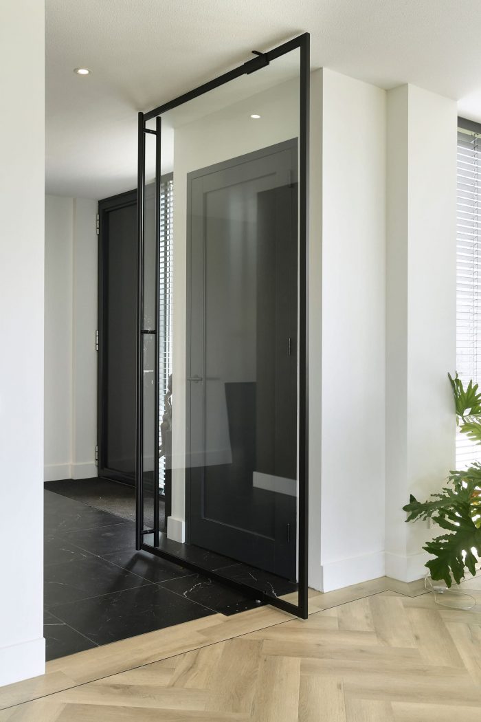 Because the rear of the house is for the greater part open, the living areas are particularly light. But without dark, no light: by combining dark elements, such as the kitchen, the window frames, and the steel pivot door, with light materials, such as white stucco, a light, oak herringbone floor, and white dining room chairs, an exciting contrast has been created. The surprise effect is also in the details and the finish. You will be captivated by the beautiful veins in the floating countertop and you will notice a subtle reference to the wood in the facade in the gold-colored notches.