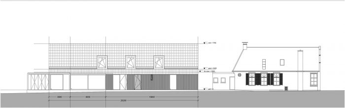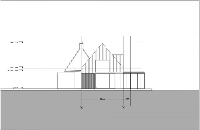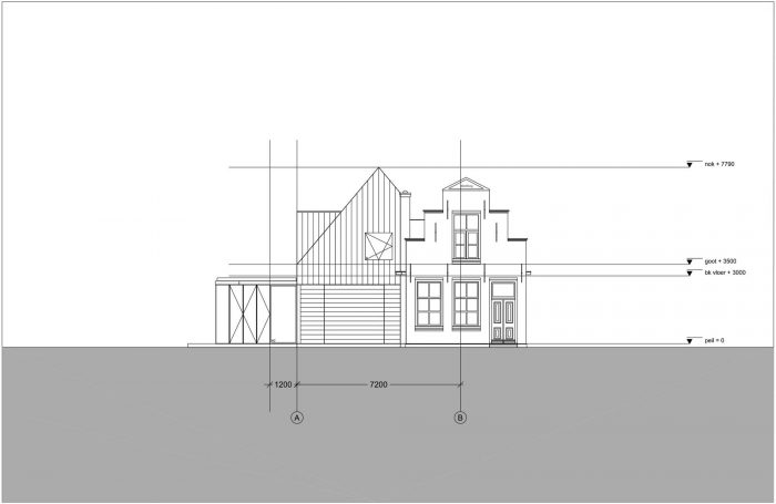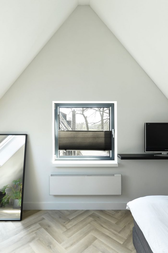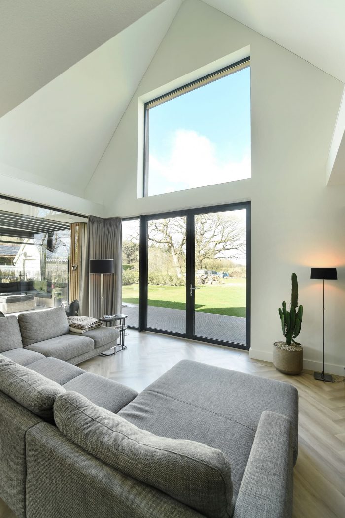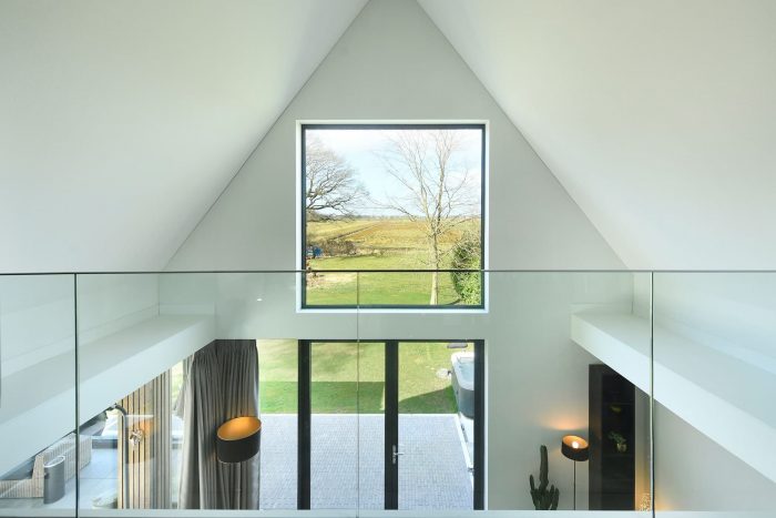 From the public street, you see little of the house. In terms of scale, the house is well-proportioned to the monument. The two houses form a contrast. The barn house is very modest in detail and material, but the monument has traditionally been designed with classical ornaments. The installations of the house are subtle. The solar panels have been placed on the roof so that they do not form a disturbing element and the solar screens have also been placed behind the facade. The facade is clad in. The garage door is also incorporated into the front facade. By keeping the front closed and the residential functions situated at the side and rear, space could be made for large windows, without losing privacy, but with a spectacular view of the wide landscape.