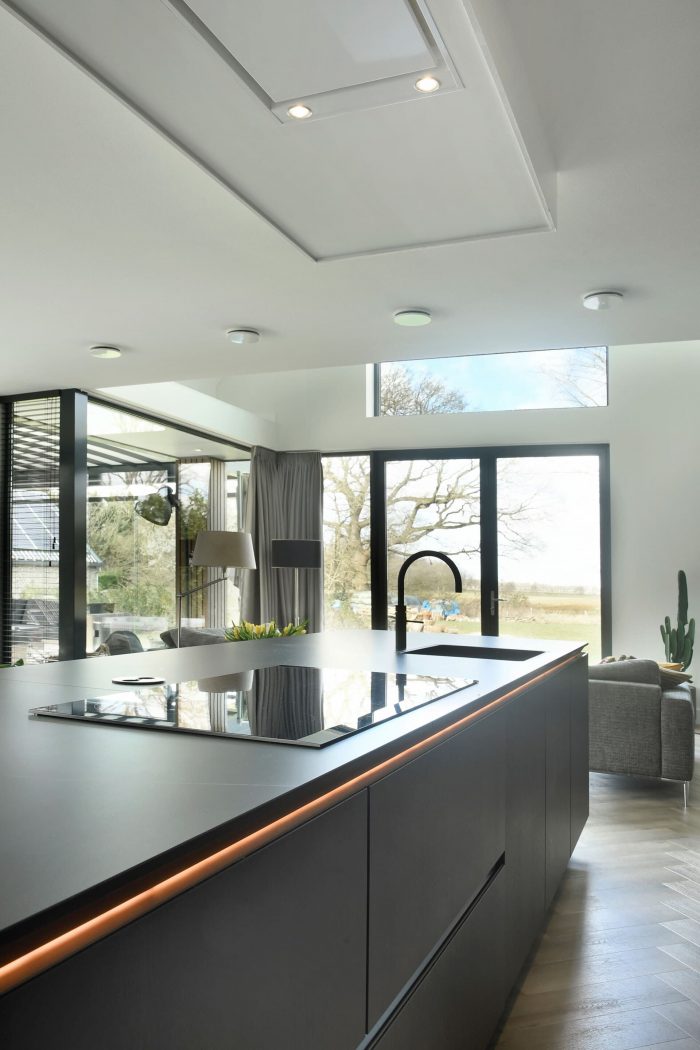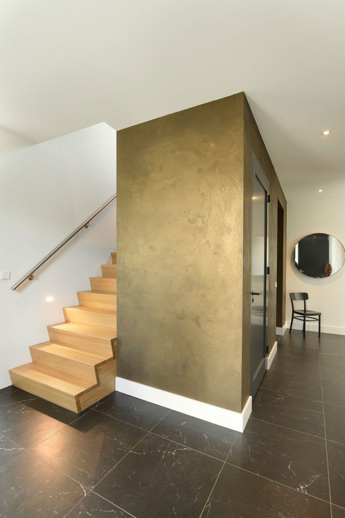 To get to the entrance of the villa, you have to go to the elongated side wall. Only then do you see the actual size of the house. Inside you immediately see that light and spaciousness formed the basis for the design. A lot of attention has also been paid to details. In terms of appearance, the wardrobe is more than a place to store coats and bags, and the golden elements, such as the walls covered with plaster, and the gold-colored tiles in the toilet, are a silent hint to the flame effect of the facade. The entrance has a staircase to the first floor, where space has been made for guests. A little further you turn to the master suite on the ground floor. This is equipped with a walk-in closet and en-suite bathroom. Future-proof living was one of the residents' wishes.