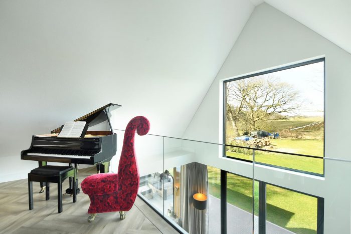 A modern house needs a modern layout. The living room, dining area, and kitchen are in open connection with each other and with the upper floor. What better place for a grand piano than on the mezzanine? Accompanied by the sweet sounds of a sonata while enjoying a glass of wine, the residents can gaze over the farmlands for hours. If it were a painting you would believe it.