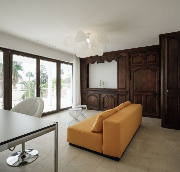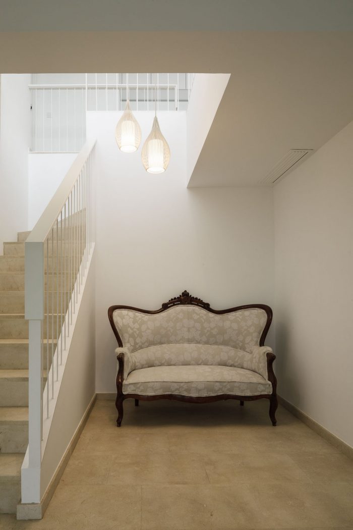 Antique furniture, dark wood doors from the original house and dark wood window frames contrast with the modern, light interior. The design combines economic, off the shelf, products with high-end, bespoke items. Colourful artworks and furniture placed in the white interior reflect the colourful bougainvillea placed within the green of the surrounding garden.