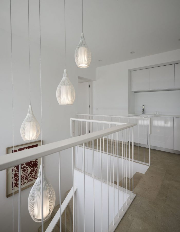古董家具、原房屋的深色木门和深色木窗框与现代的浅色内饰形成对比。设计结合了经济的、现成的产品和高端的、定制的物品。放置在白色室内的彩色艺术品和家具反映了放置在周围花园的绿色中的彩色九重葛。