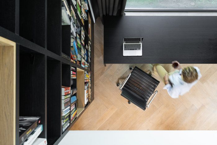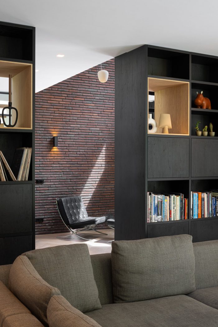 The color and material palette of the house has been kept limited to ensure that the house does not overshadow its green surroundings. The façade is clad in coral-red masonry provided by Van de Moortel, the linea 3016 to be precise. The natural nuance of the brick creates a lively and modern look. The recessed horizontal joints accentuate the clean horizontal lines of the house, where the slender, black-grey aluminum window frames and steel fascias contribute to the modern appearance.