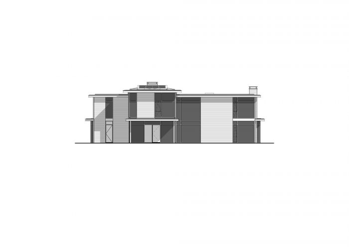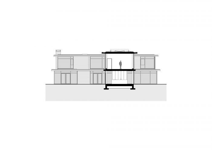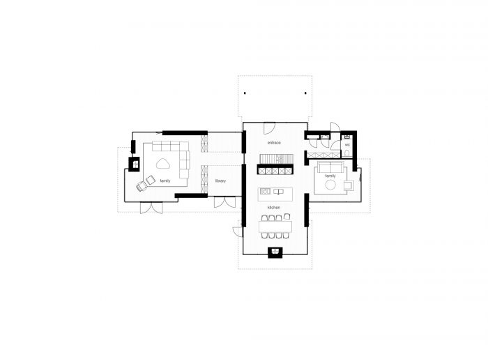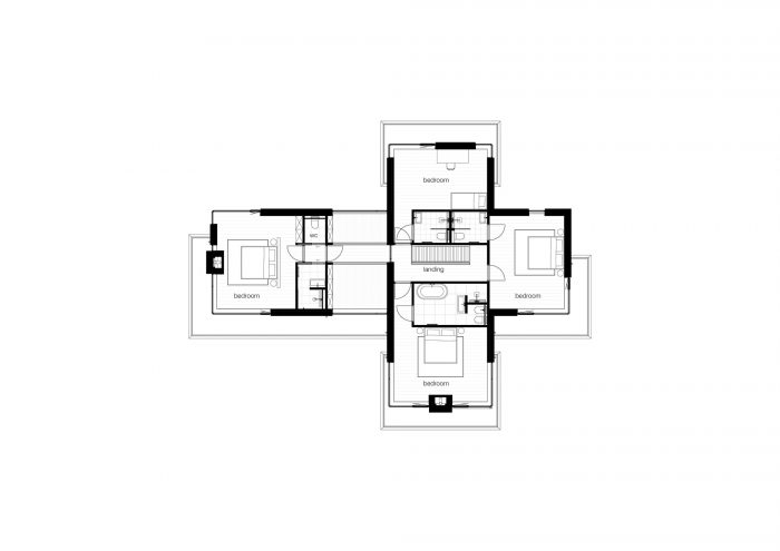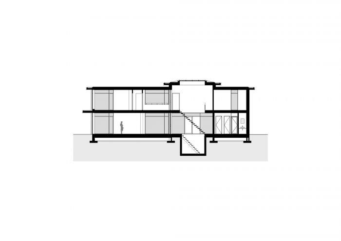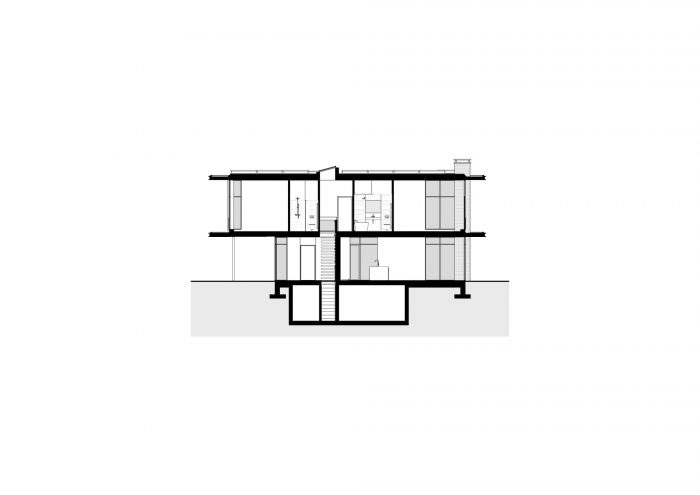 该设计由两个拉长的体量组成,它们相互垂直放置,由于体量的高度差异,仍然可以单独辨认。这两个体量共同构成了一个十字形的构图,使所有的生活区域都有充足的日光。