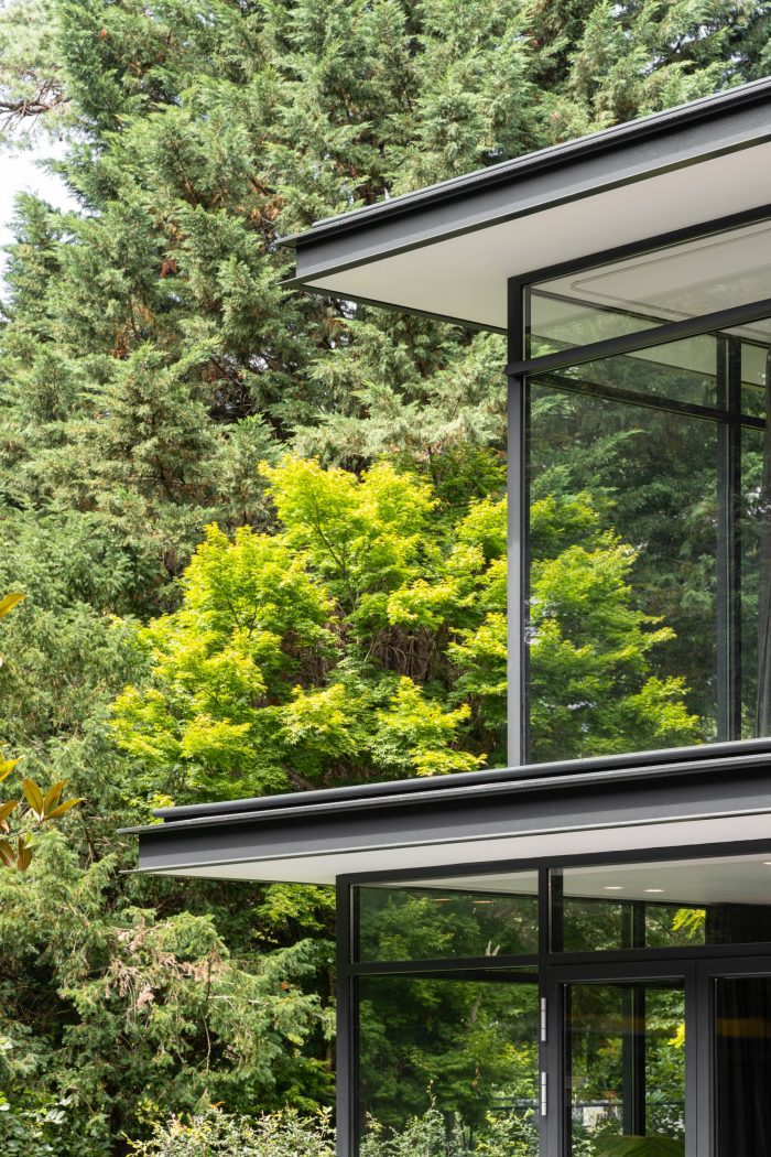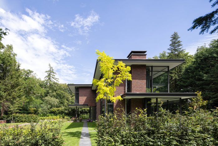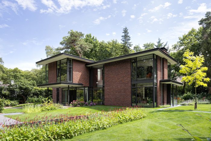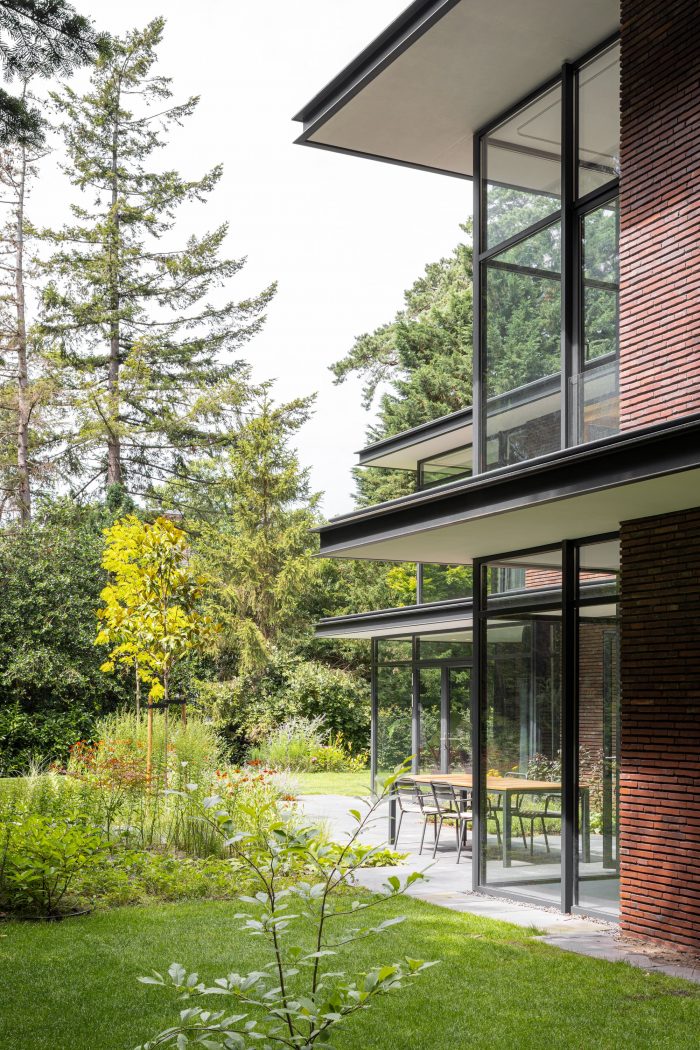 In the summer months, direct sunlight is blocked by canopies, which in addition to their aesthetic function, also keep the house cold during these months. The house is characterized by strong horizontal lines, which are accentuated by the canopies and the use of elongated bricks. Large glass surfaces provide a strong connection with the surrounding greenery, without compromising privacy.